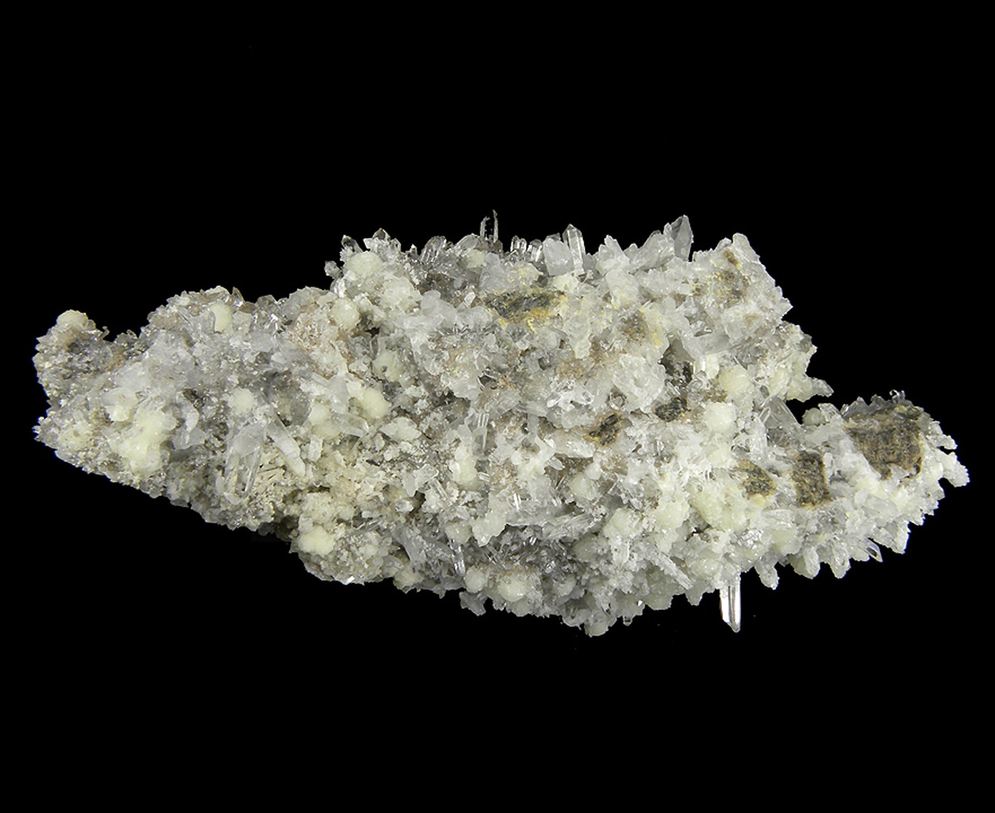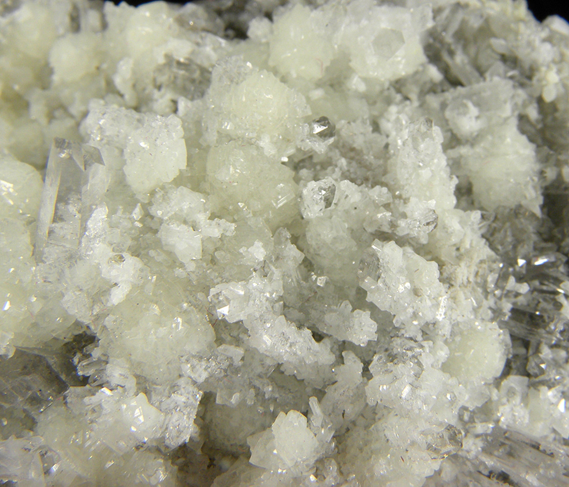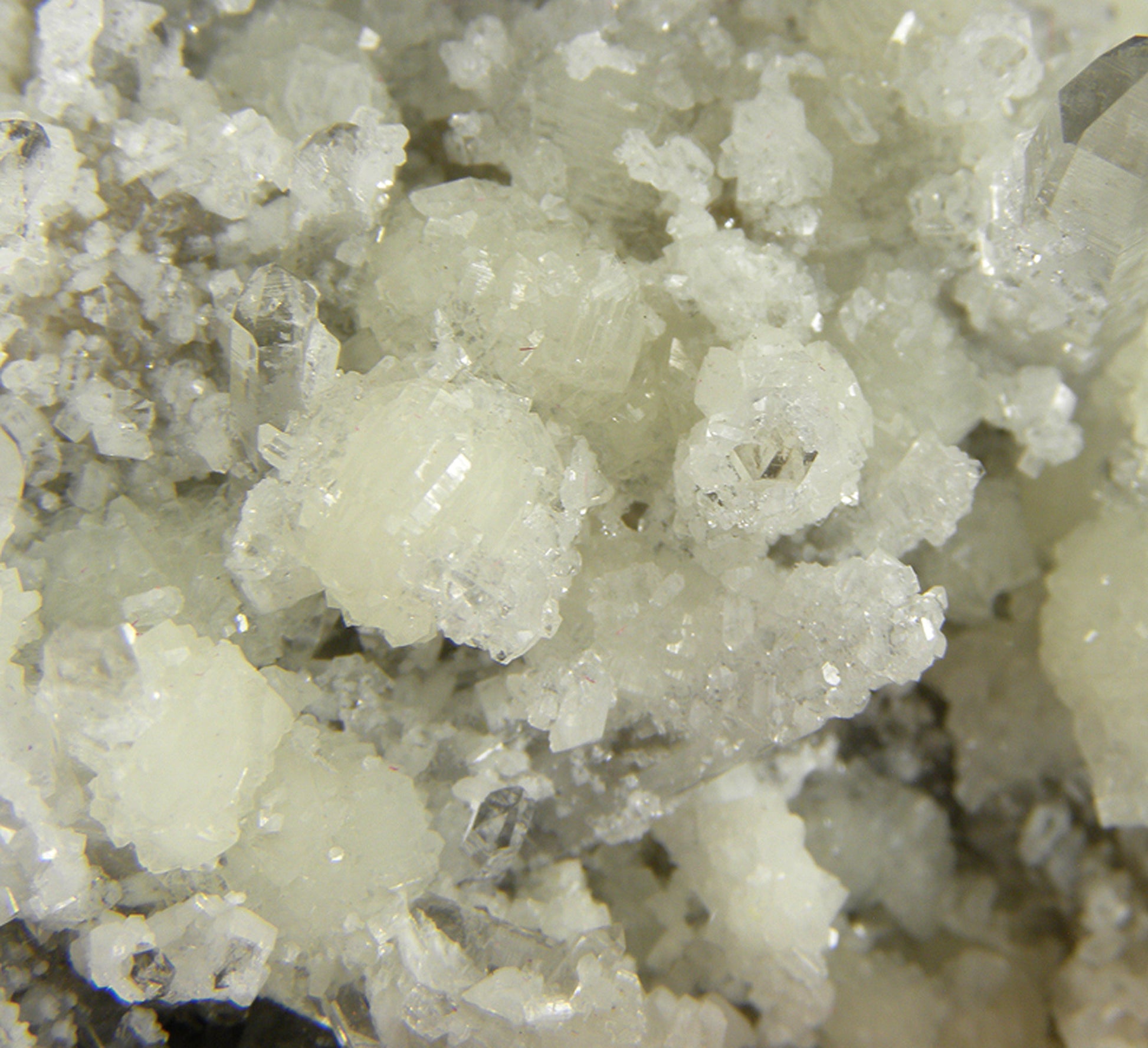 Some well-crystallized and translucent light yellow color Wavellite “balls” are intermixed with gemmy, prismatic, colorless Quartz crystals on matrix. The quality is good for the species, and under magnification, the Wavellites are certainly impressive from a crystallization standpoint.