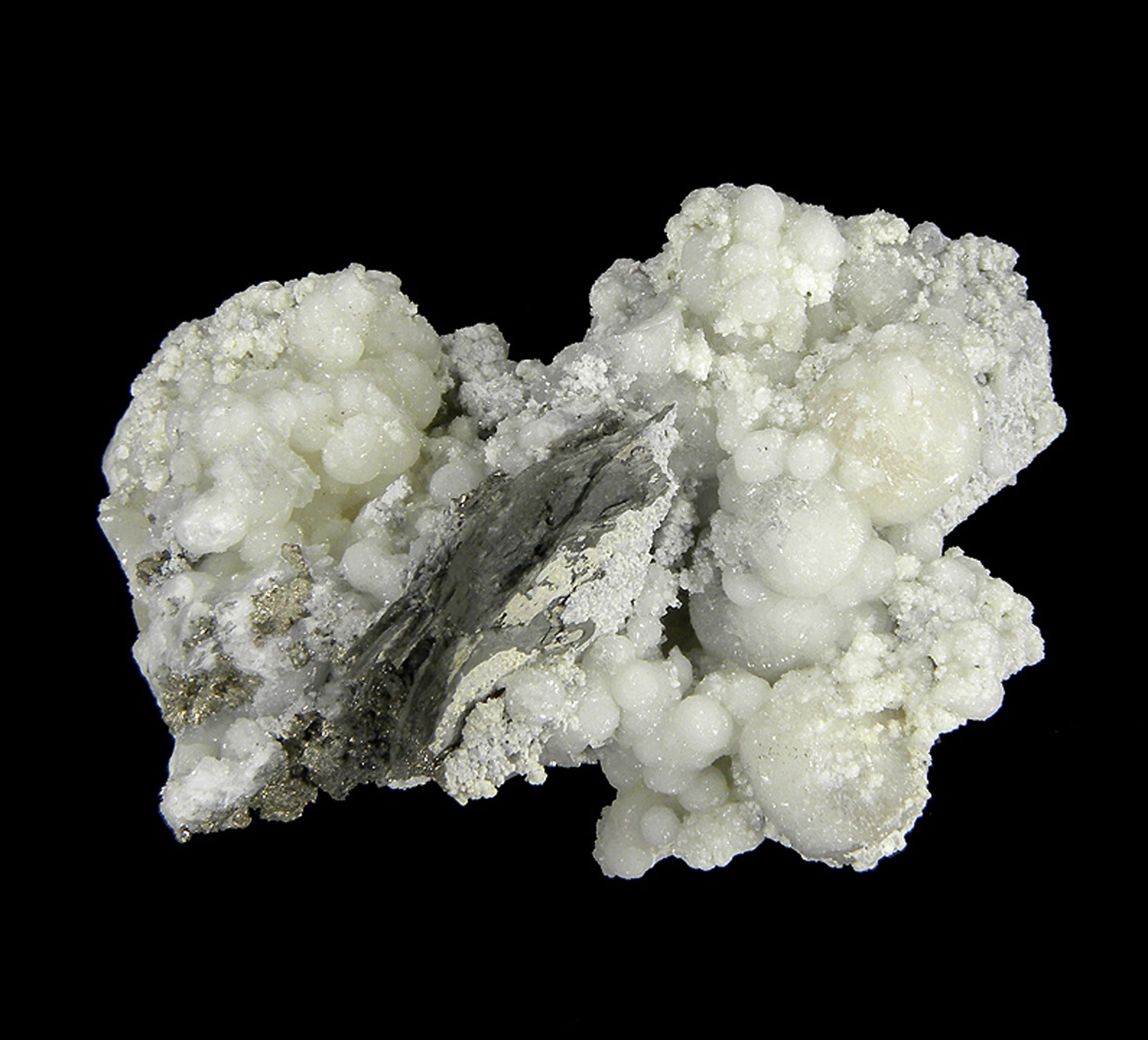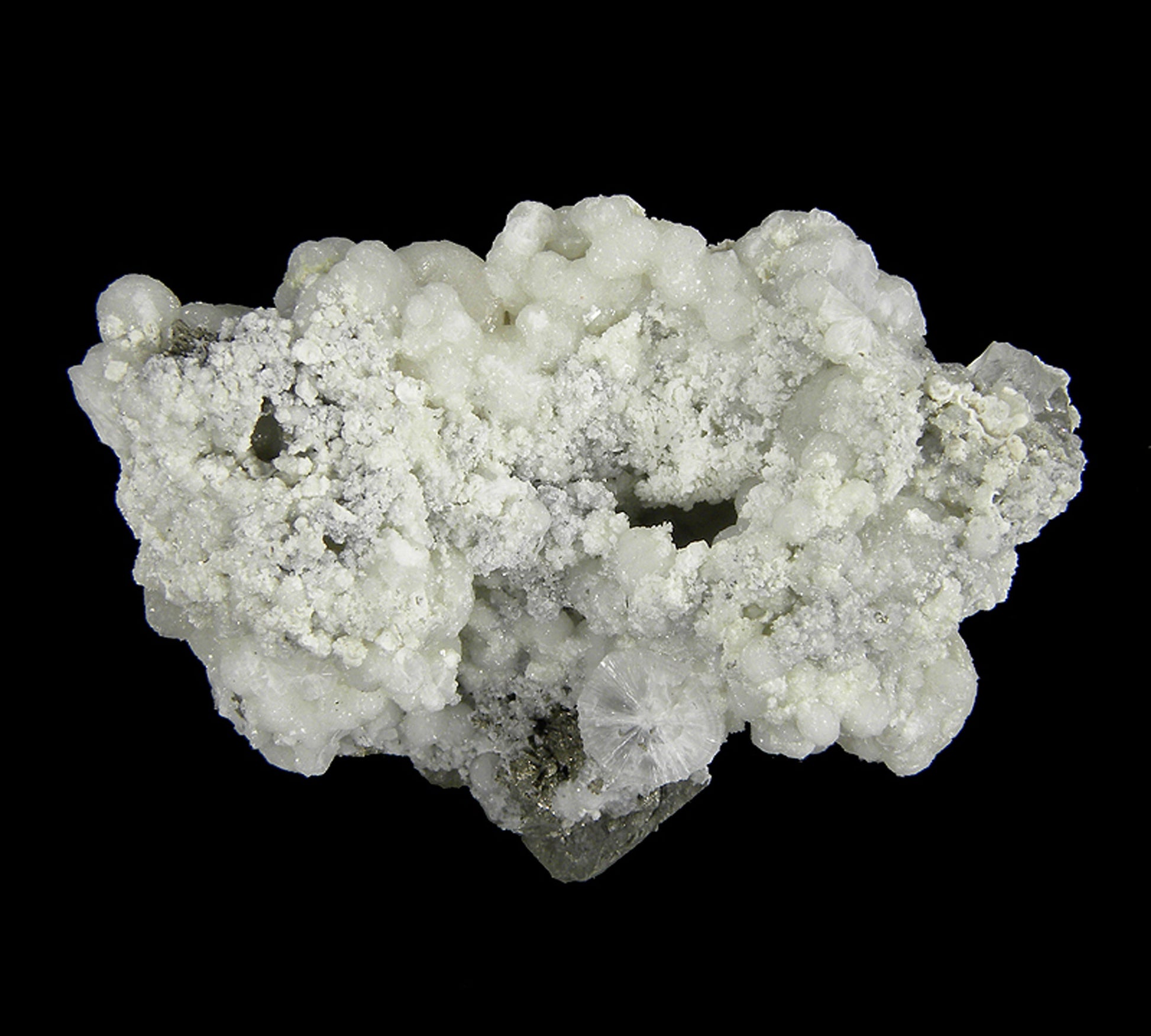 This piece is a fine Wavellite featuring satiny, whitish-silvery colored radiating “balls” with rarely seen golden bladed Pyrrhotite. Certainly, a good association specimen from this famous locality, and great quality for Wavellite in general.