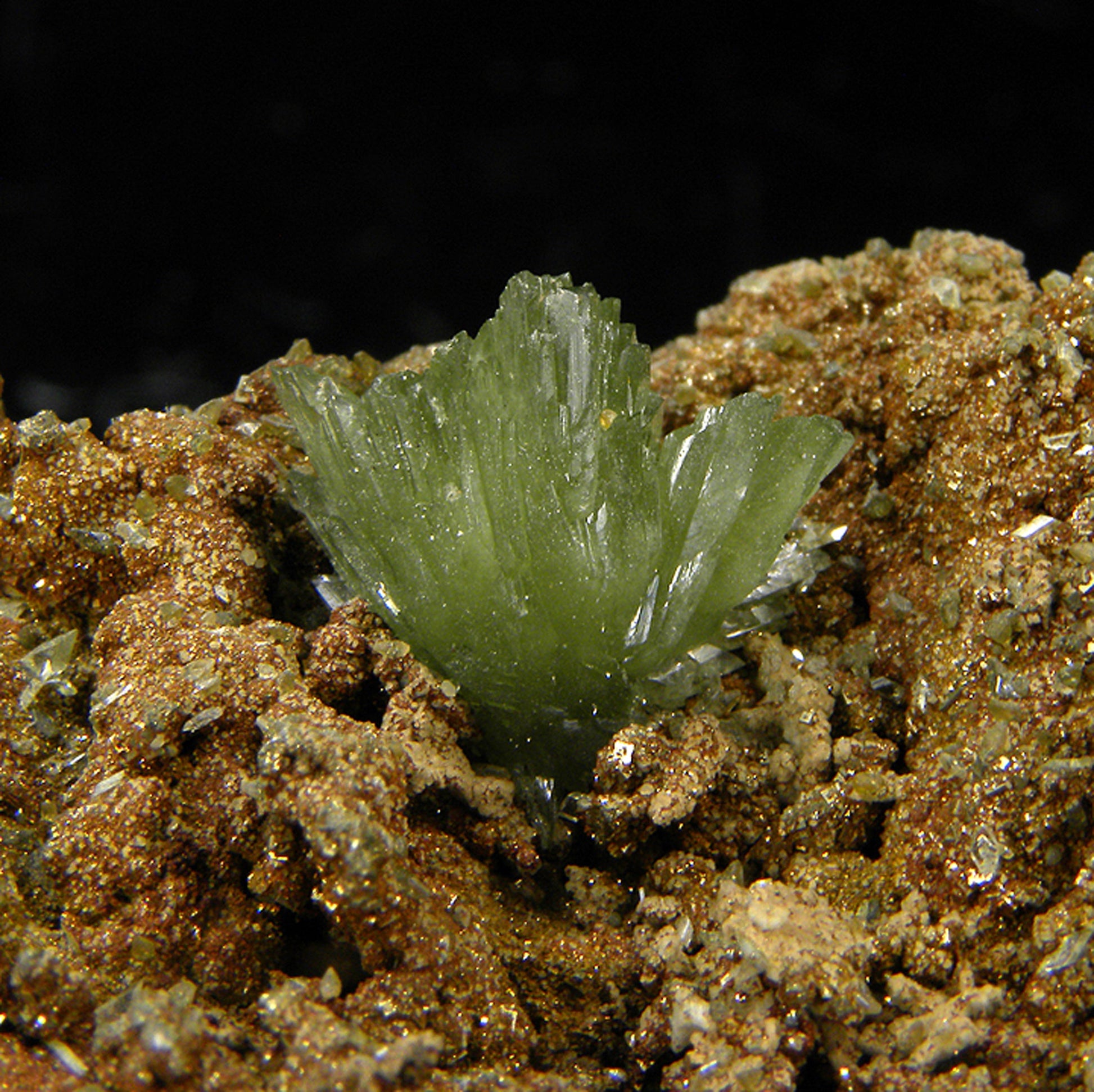 This piece features a pair of beautiful “sunburst”-like sprays of pleasing green color Ludlamite with good luster, sharpness and translucency/gemminess sitting on wonderfully contrasting brownish Limonite with golden metallic underlain Pyrite. Great condition overall, and a superb representation of the species and the locality.