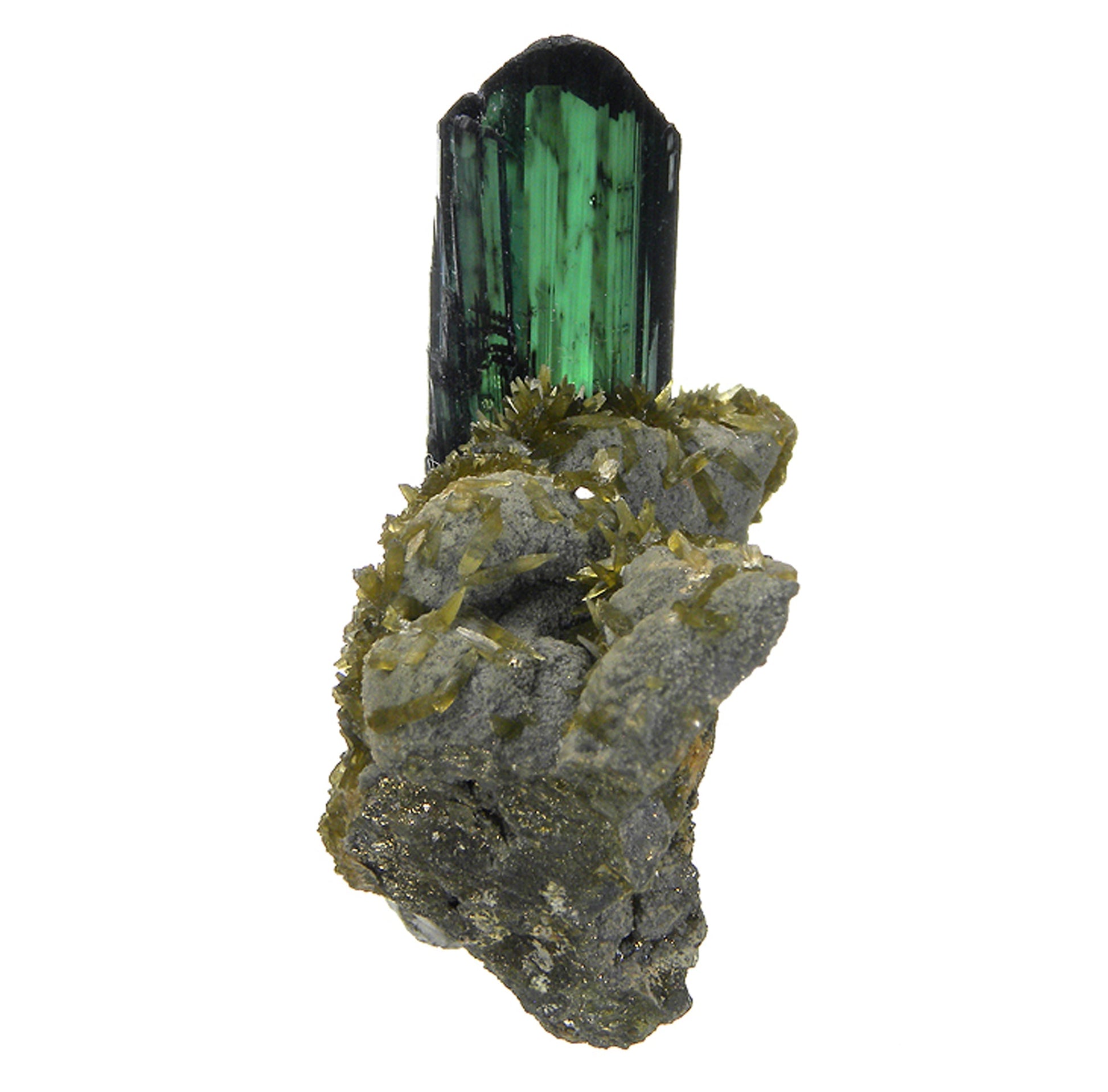 The piece features an excellent, very sharp, GEM quality, highly lustrous, rich blue green, “sword”-shaped crystal with a beautiful termination with golden Siderite and aesthetically flaring off Pyrite matrix. A great quality piece from Huanuni, and certainly better quality than a lot of Vivianites from this mine from the standpoint of gemminess and color, plus the fact that it’s aesthetically sitting on matrix.