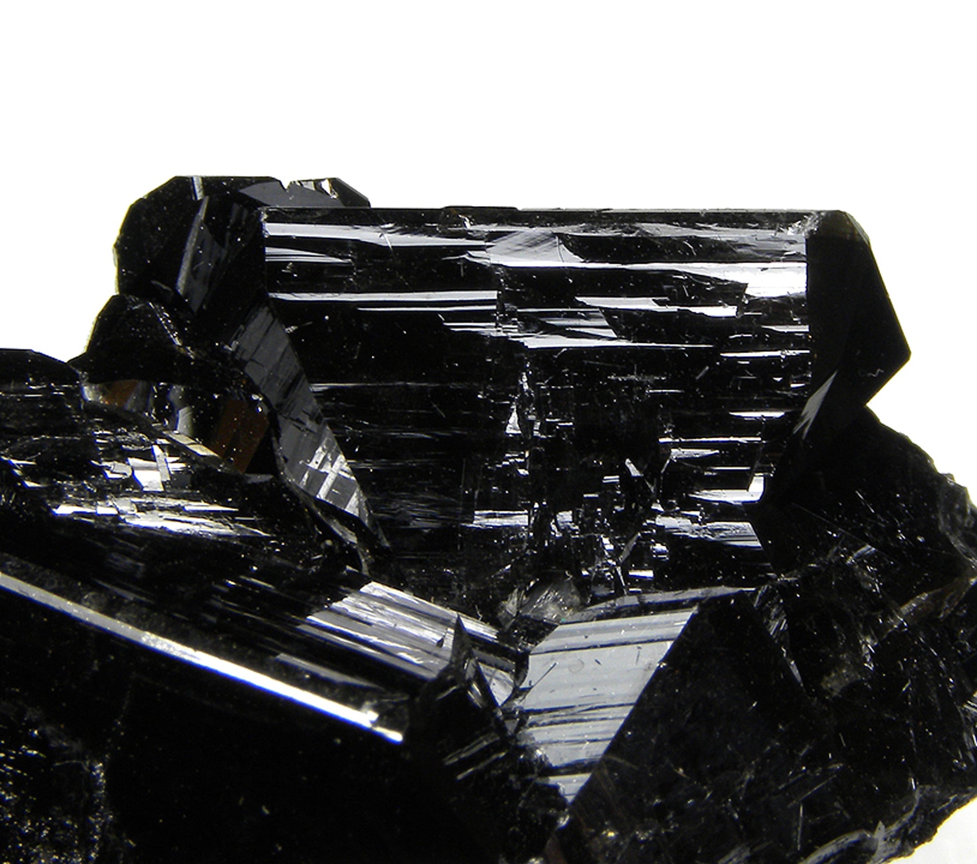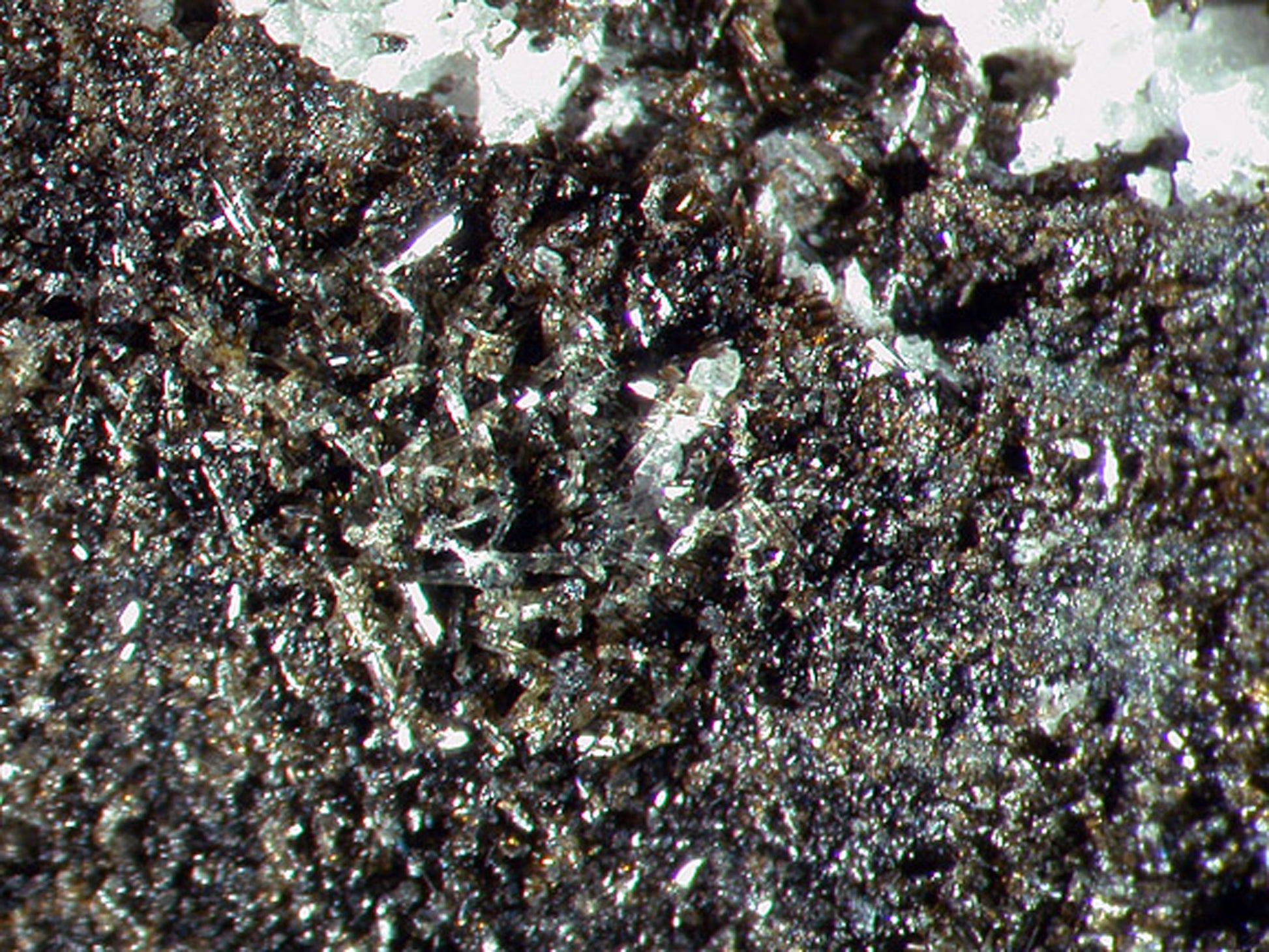 This piece is a good, lustrous, sharp, black to very dark golden colored cyclic twinned crystal group which is associated with small acicular crystals of rarely seen greenish-brown Tourmaline. Only a small percentage of the Cassiterites from Viloco are associated with Tourmaline. I photographed the Tourmalines under the microscope to better illustrate their unique nature. A cool association specimen from this classic locality.