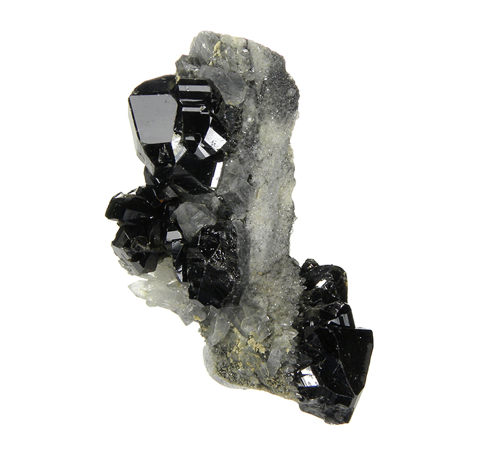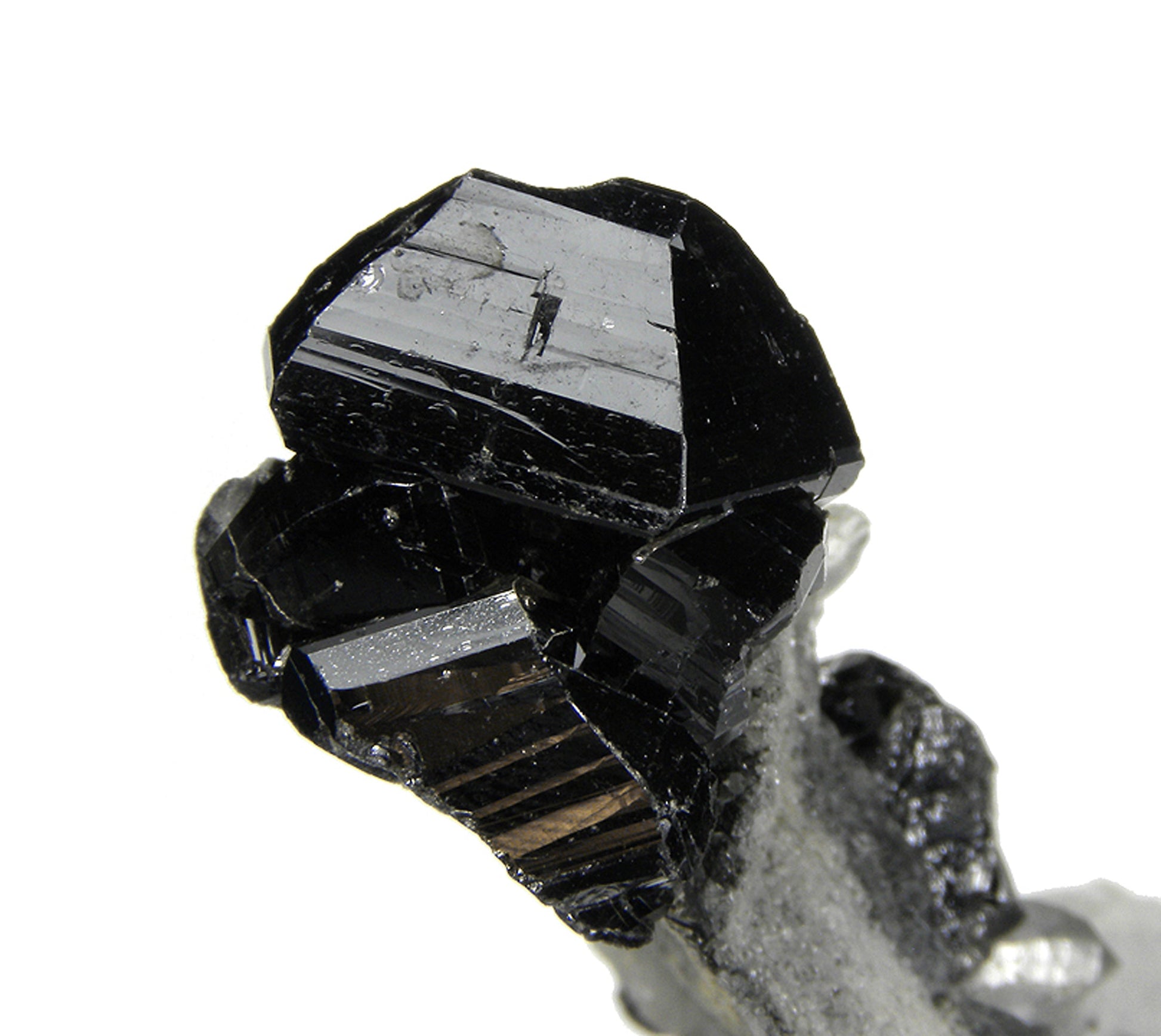 This piece features several superb, lustrous, sharp, black cyclic twinned crystals which are associated with Quartz on matrix. A worthwhile and aesthetic smaller specimen of this classic material.