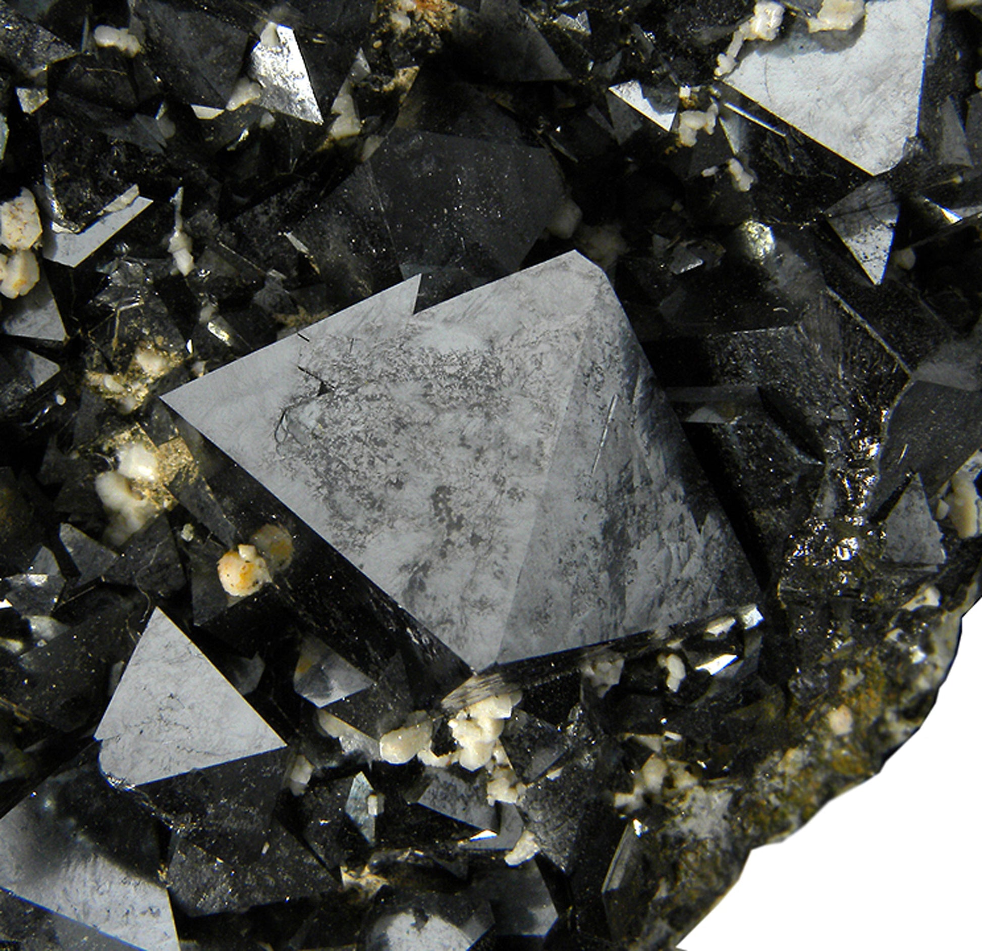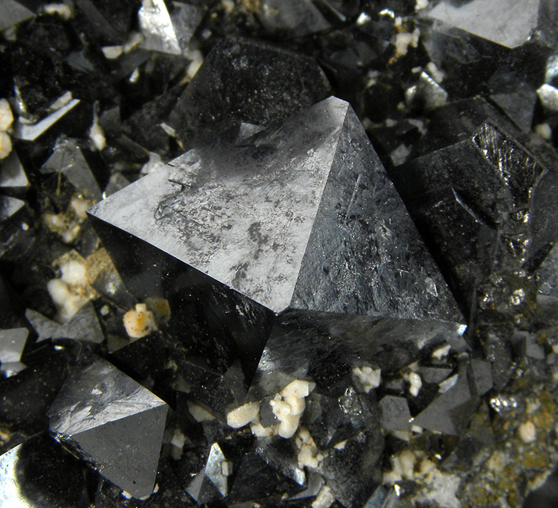 Typically, the Magnetite specimens from this locality are closely grown together, and this is a great example of said material. The piece has fine, good sized, sharp, lustrous, black, metallic, "Alpine-type" octahedra (some are twinned) associated with cream colored Feldspar on matrix. Great quality for the species and the locality, and the faces on the Magnetite crystals are rather smooth and shiny.
