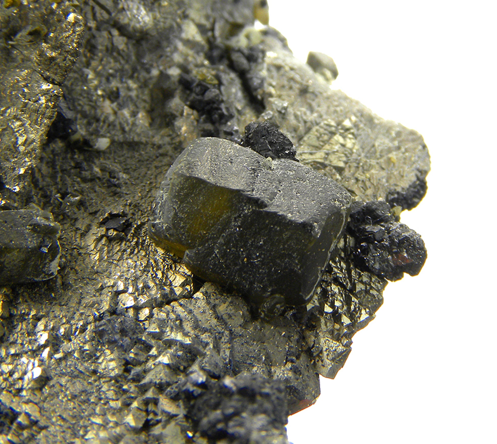 This piece features a sharp, lustrous, large Pyrite pseudomorph after compressed rhombohedra of Siderite which is associated with sharp, translucent greenish-brown colored Siderite crystals and minor grey crystals of the rare sulfide, Stannite. So far, this find was very limited, so if you're a collector of Bolivian minerals, be sure to pick this one up.