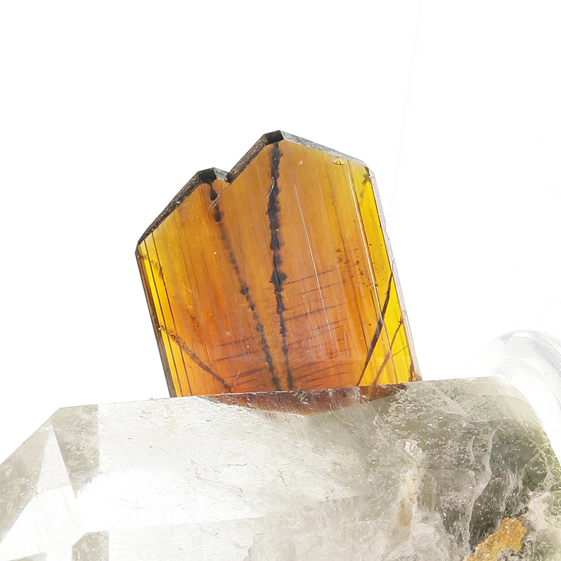 A very aesthetic thumbnail specimen from Pakistan featuring a pair of sharp, "sword"-shaped crystals with a glowing golden-orange hue and thin black internal "phantoms" which are growing at nearly a 90 degree angle off of a single, sharp, lustrous, gemmy, colorless prismatic hexagonal Quartz crystal with minor green Clinochlore "Chlorite" inclusions at the base. The Brookites measure up to 1.1 cm long and are completely undamaged. What an eye-catching and fine quality specimen of this now classic material.
