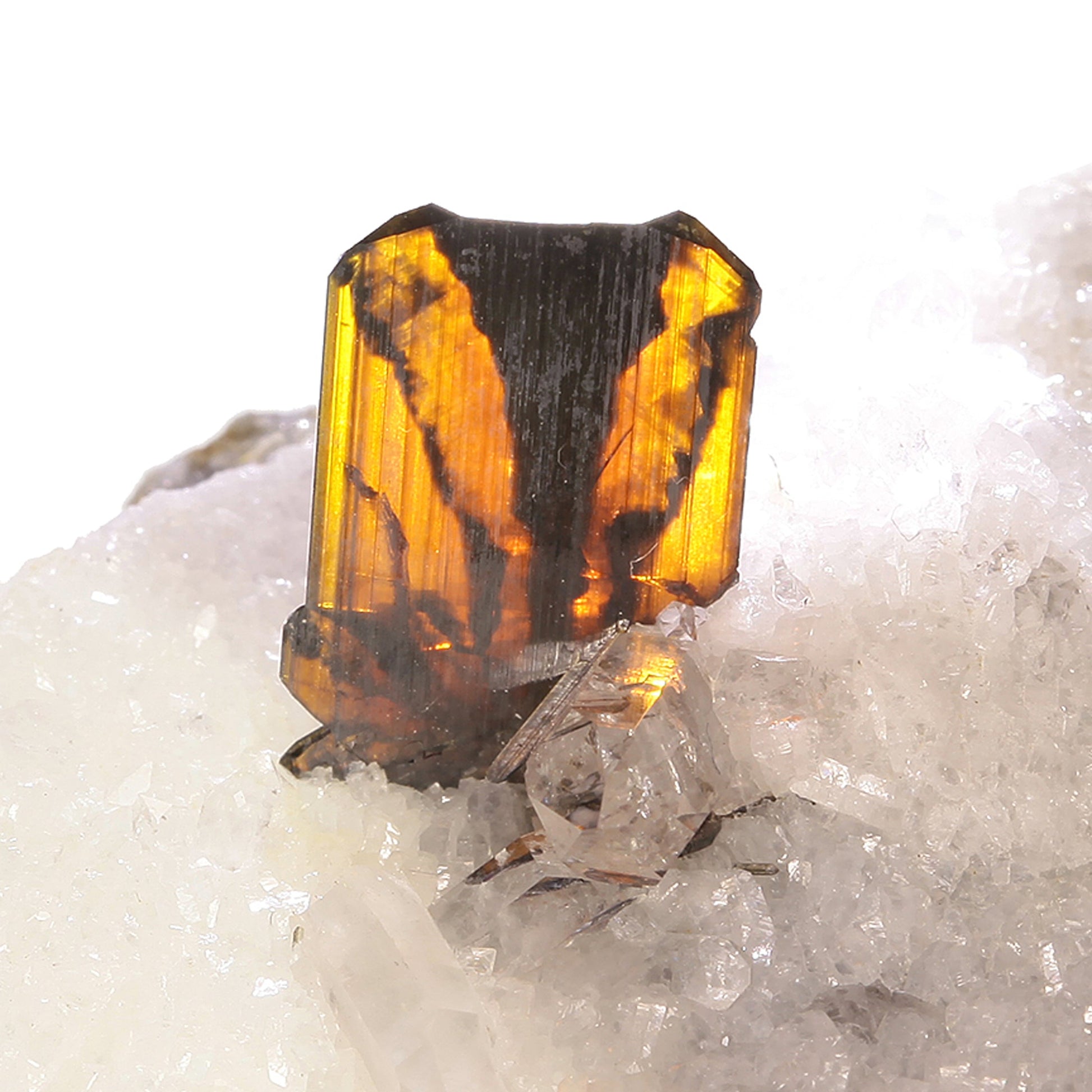 This is a wonderful small cabinet display specimen of Brookite with Quartz from Pakistan featuring a group of sharp, thin, lustrous blades measuring up to 1.0 cm long free-standing on a thin plate of host rock matrix with several associated GEM quality, colorless Quartz crystals. The color of the Brookites is a glowing golden-orange, but my favorite aspect of them is the repeating "fan"-like pattern created by the internal black "phantoms". Great quality all around, and while the main Brookites are undamaged, there are a few partial blades of Brookite on the piece which are not fully terminated. It's still a very showy specimen of this classic material, and the effect of the "phantoms" is rarely seen in Brookite in my experience.