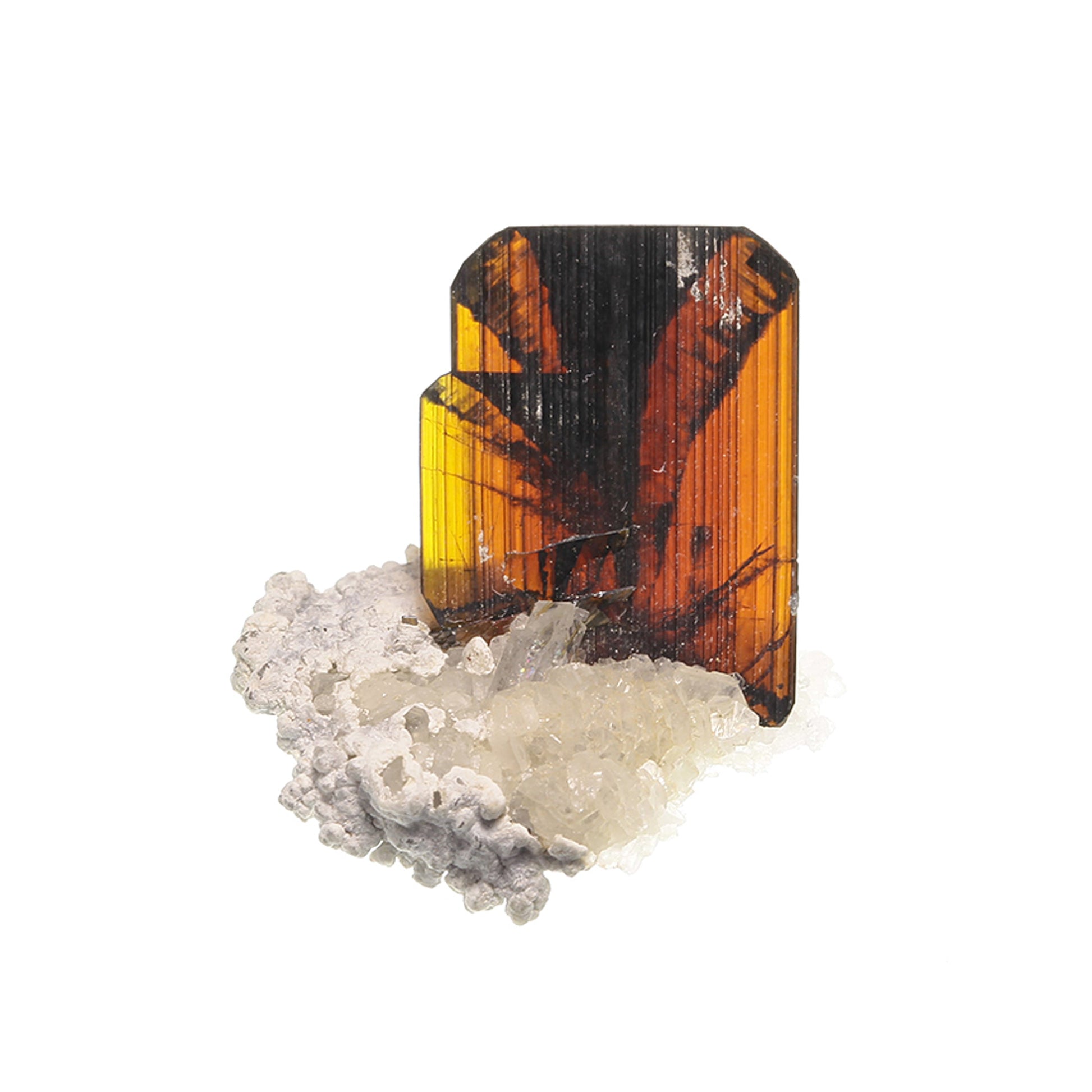 A fine quality and aesthetic thumbnail specimen featuring a pair of thin, tabular, squared blades of Brookite measuring up to 1.6 cm perched atop a thin layer of matrix with minor associated Quartz. The Brookites have a fiery red-orange color and the gorgeous patterning of the internal black "phantoms" makes them all the more desirable. No damage, incredibly showy and one of the best thumbnails in the lot in terms of quality and composition.