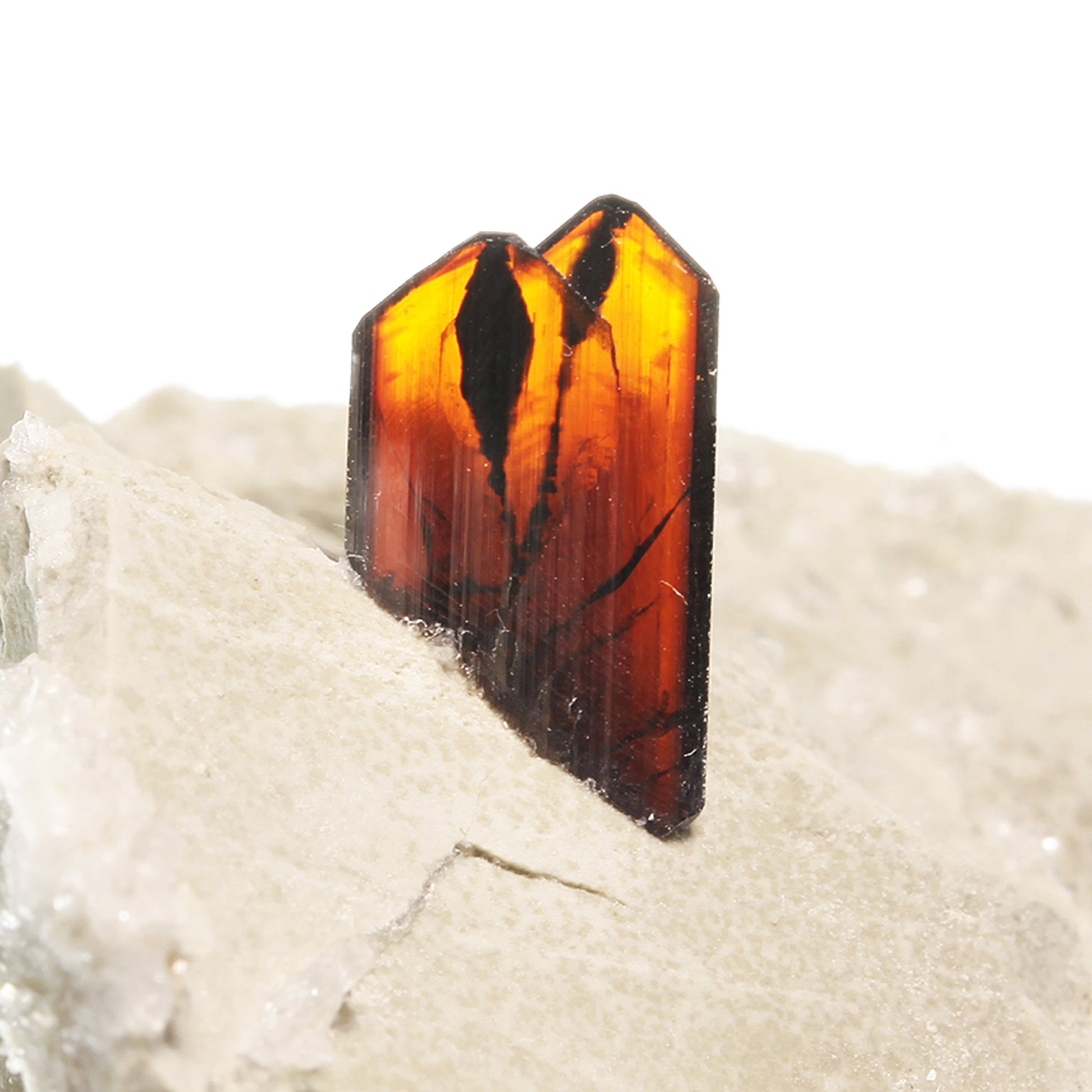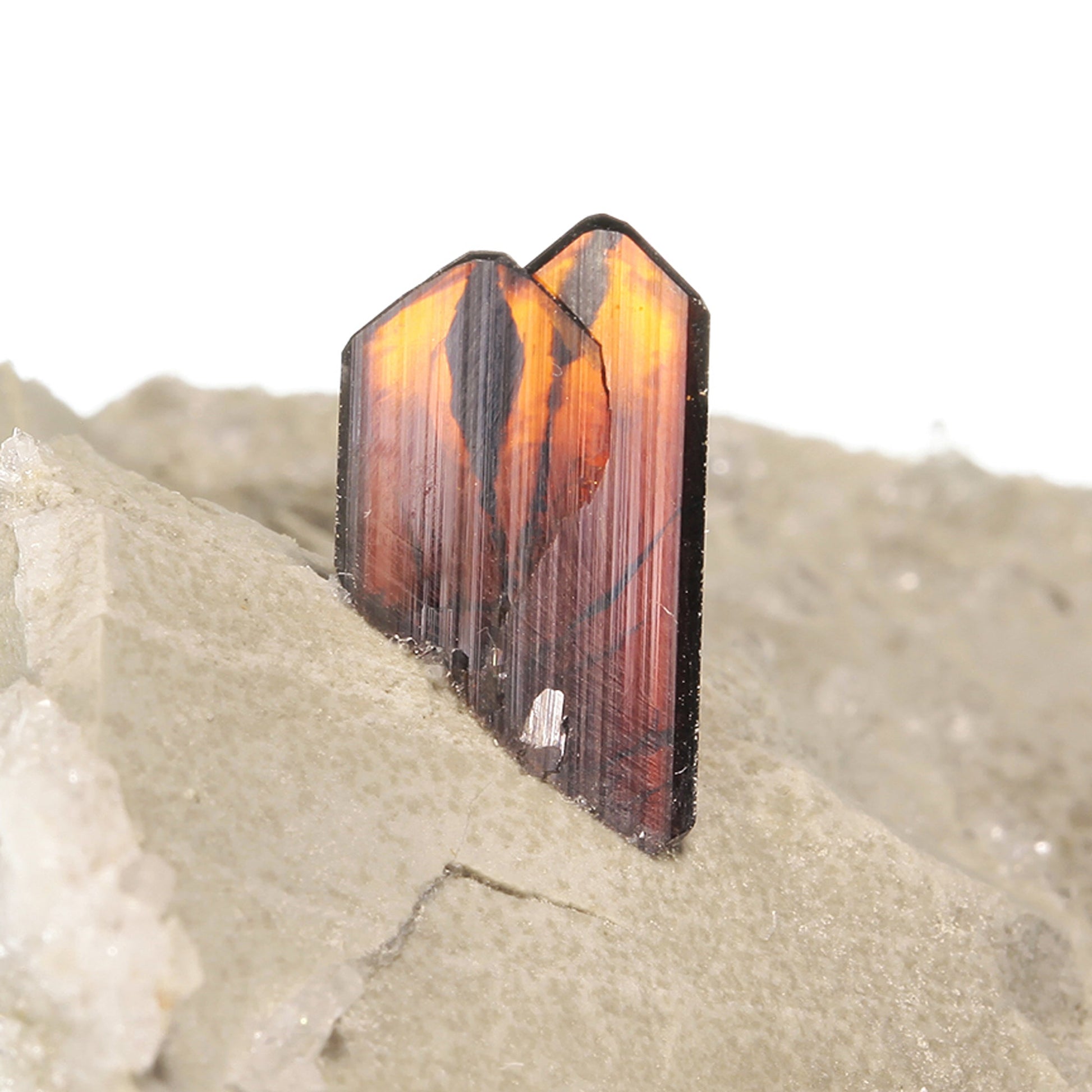 A pair of attractive, sharp, fine quality, lustrous, gemmy, Brookite crystals measuring up to 1.1 cm are aesthetically set atop the underlying host rock matrix. The Brookites feature rich red to amber hues along with black "phantoms" like the classic specimens from the European Alps. No damage to the Brookites and it's not very often that one finds such superb eye-catching examples of the species like this in near full-size cabinet display specimens.