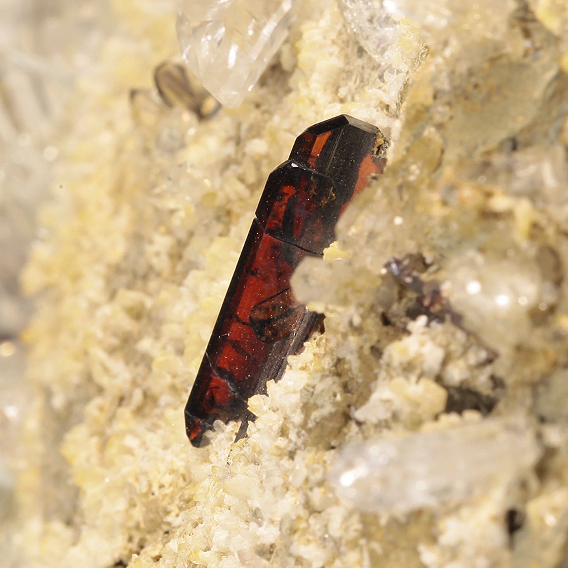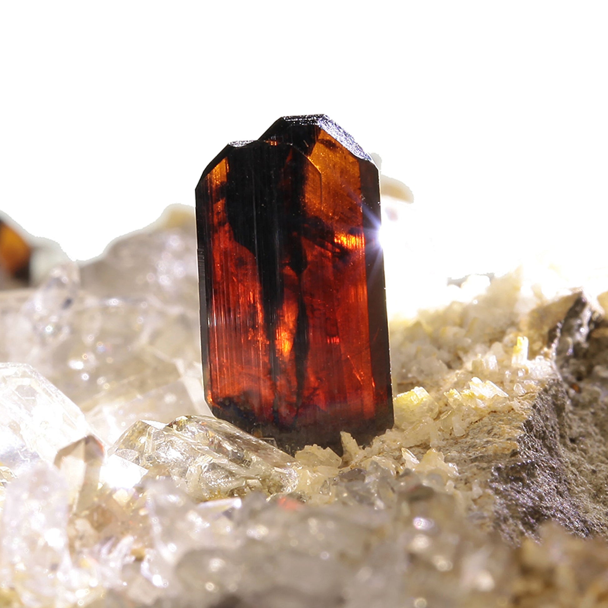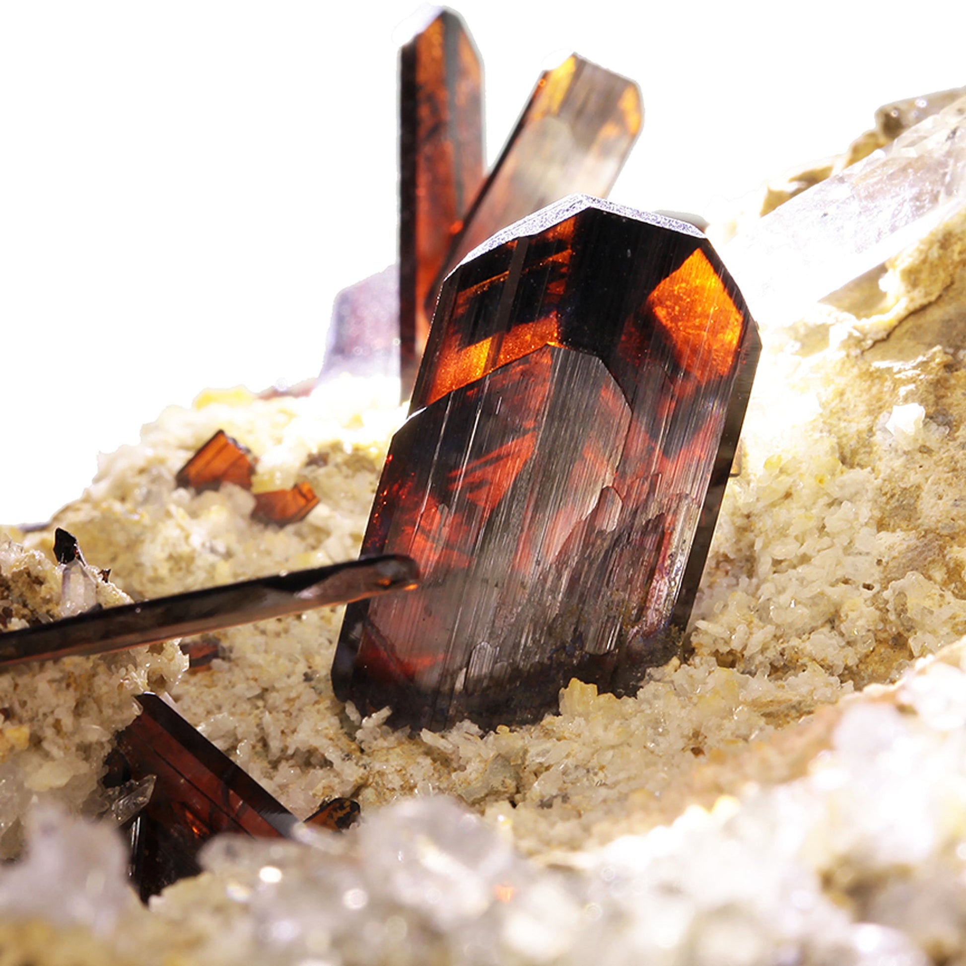 This is a superb cabinet specimen of this now classic material from the Kharan District in Pakistan. There are three aspects to this specimen that make it stand out from so many others on the market. First, the majority of the Brookite crystals are free-standing, which is remarkable for the species, as most Brookites are found lying flat on matrix. Secondly, the specimen has excellent isolation and spacing between the Brookites, giving the viewer several spots on the piece to enjoy the crystals. Lastly, the accompanying Quartz crystals are nearly equal sized to the Brookites and just as evenly spread out, so the piece has wonderful balance. The Brookites on this specimen show some of the richest red hues of any piece in the lot, and when backlit, you can see that they feature very eye-catching internal black "phantoms" creating some of the most picturesque patterns. Virtually every Brookite crystal is undamaged, and the fact that they are big (for the species) makes this piece even more enticing. Many of the Quartz crystals are GEM quality and create a wonderful contrast against the fiery Brookite blades. A fantastic display piece of Brookite from this remarkable locality.