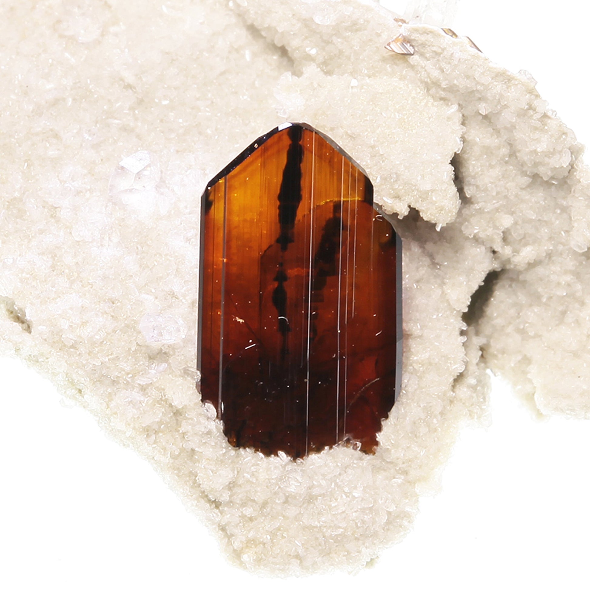 An elegant thumbnail sized specimen of these now classic Pakistani Brookites. This piece hosts a pair of sharp, gemmy, "sword"-shaped crystals of fiery orange-red colored Brookite with a few minor Quartz crystals sitting attractively on host rock matrix. Both of the Brookite crystals feature attractive black "phantoms" in their centers. The piece is damage free and fine quality for the species.