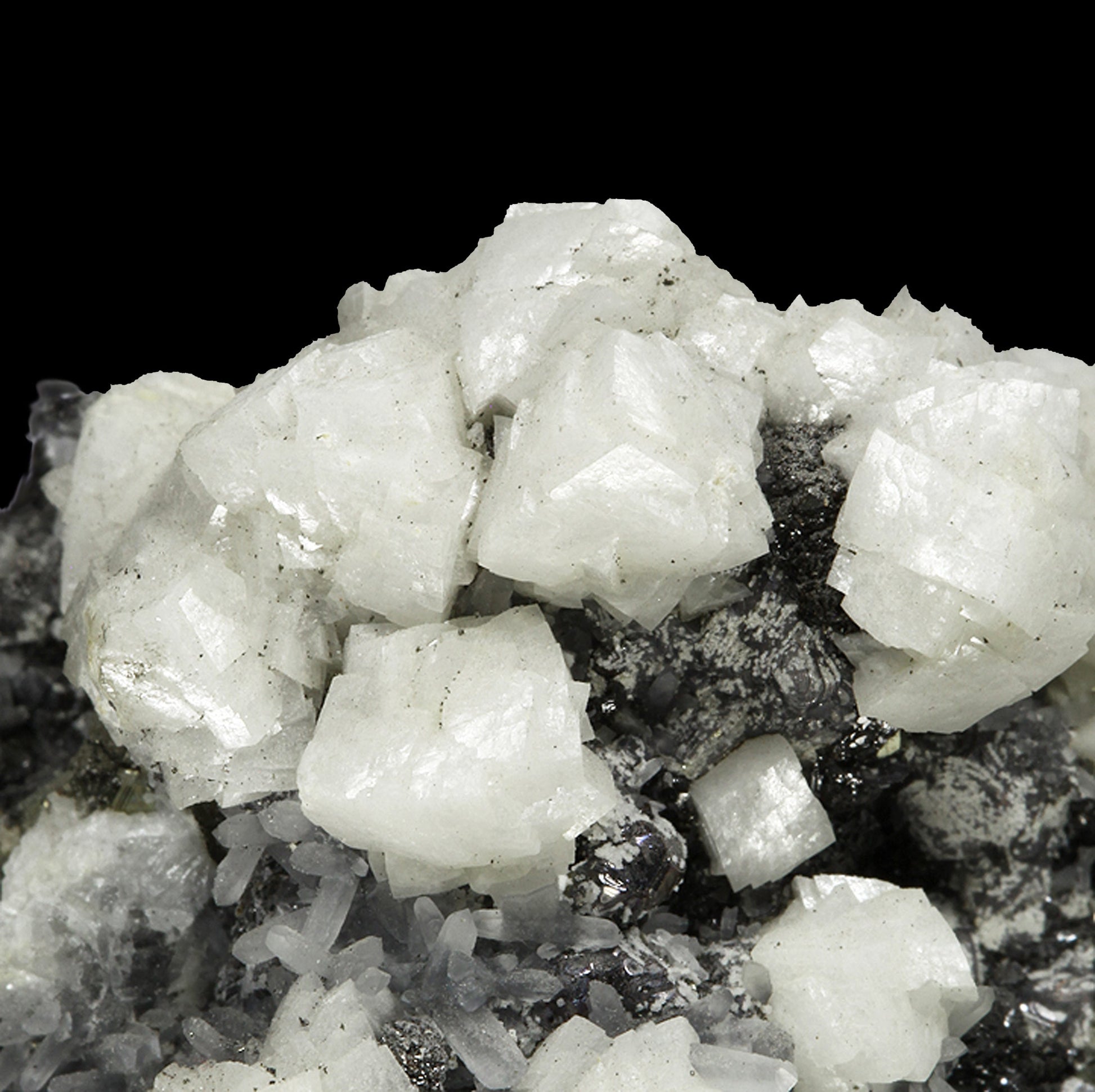 A wonderful display specimen from the famous Black Cloud mine featuring razor-sharp, vitreous rhombohedra of cream-colored Dolomite – some of which are oriented into spherical aggregates – which are sitting atop black Sphalerite, silvery Galena and golden Pyrite matrix. Excellent quality and wonderful aesthetics.