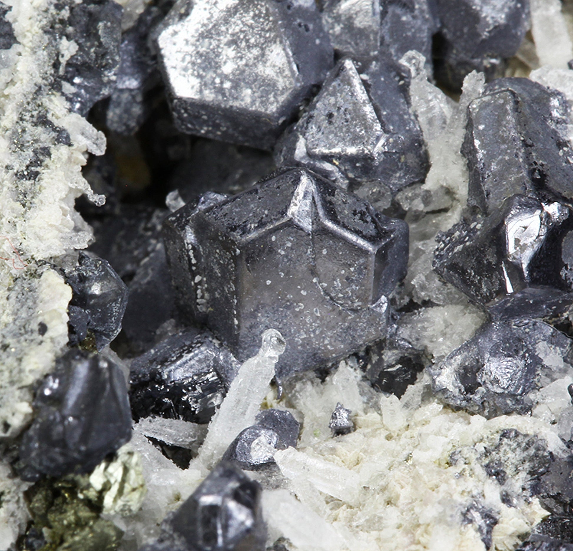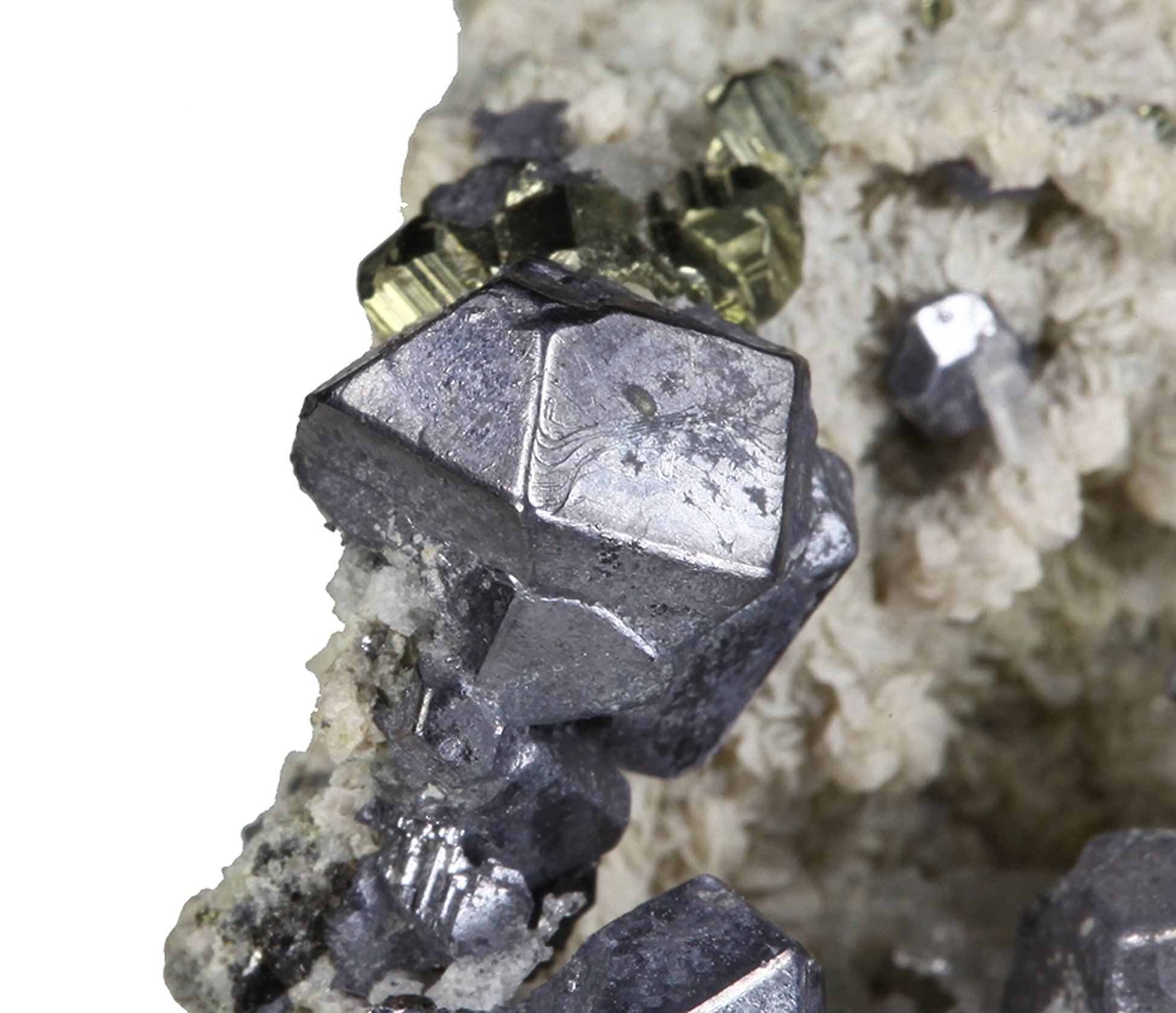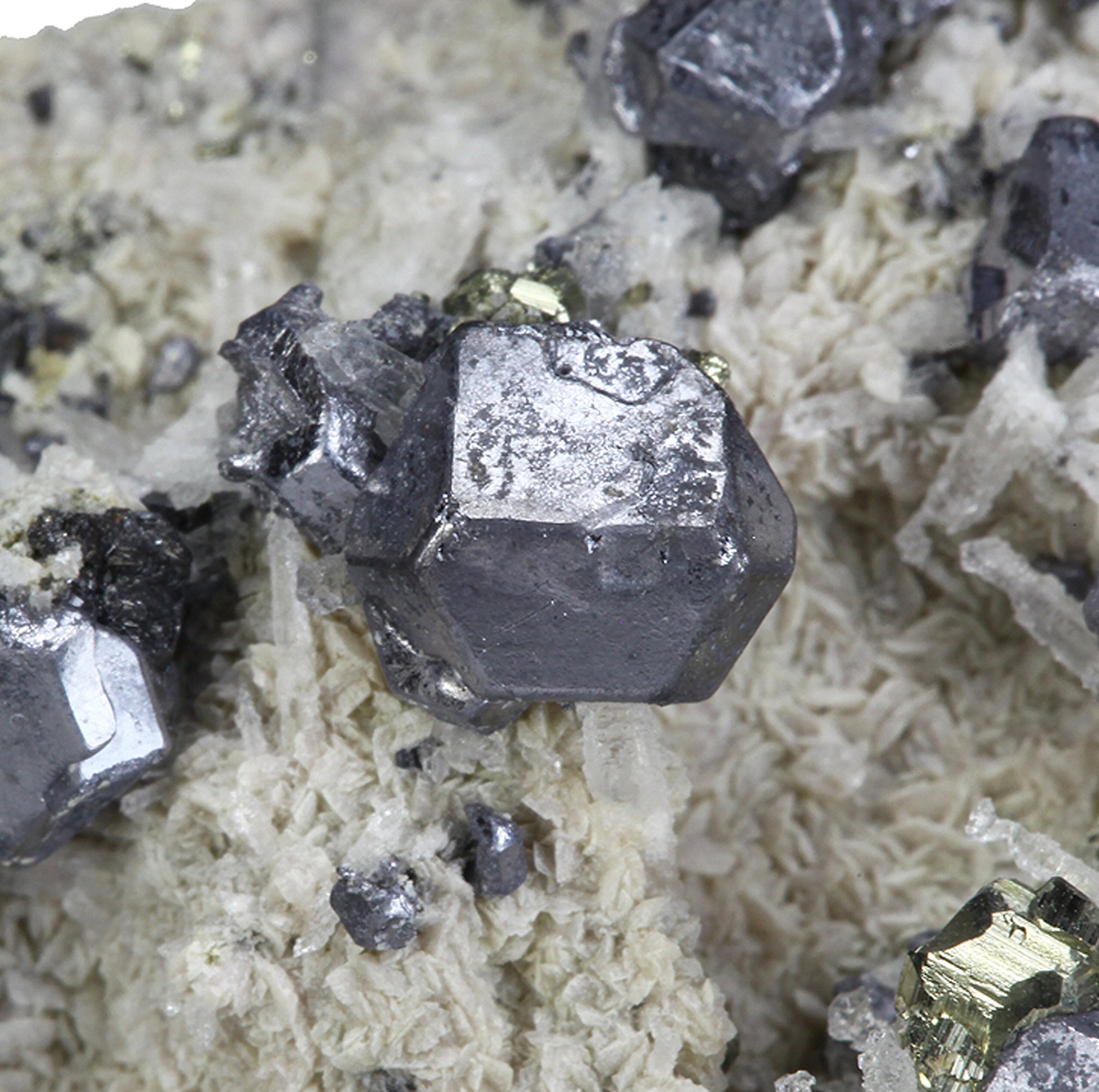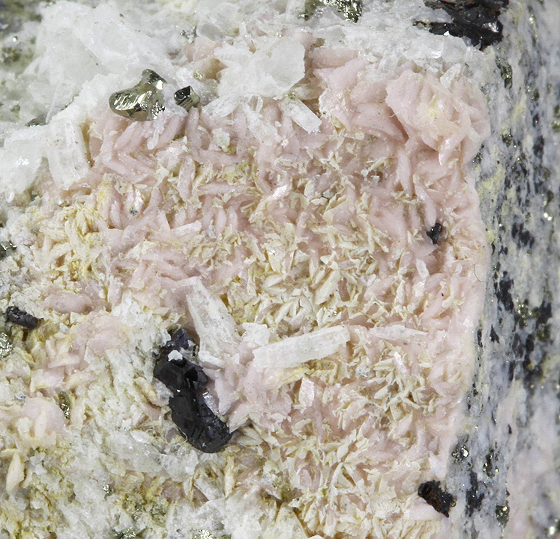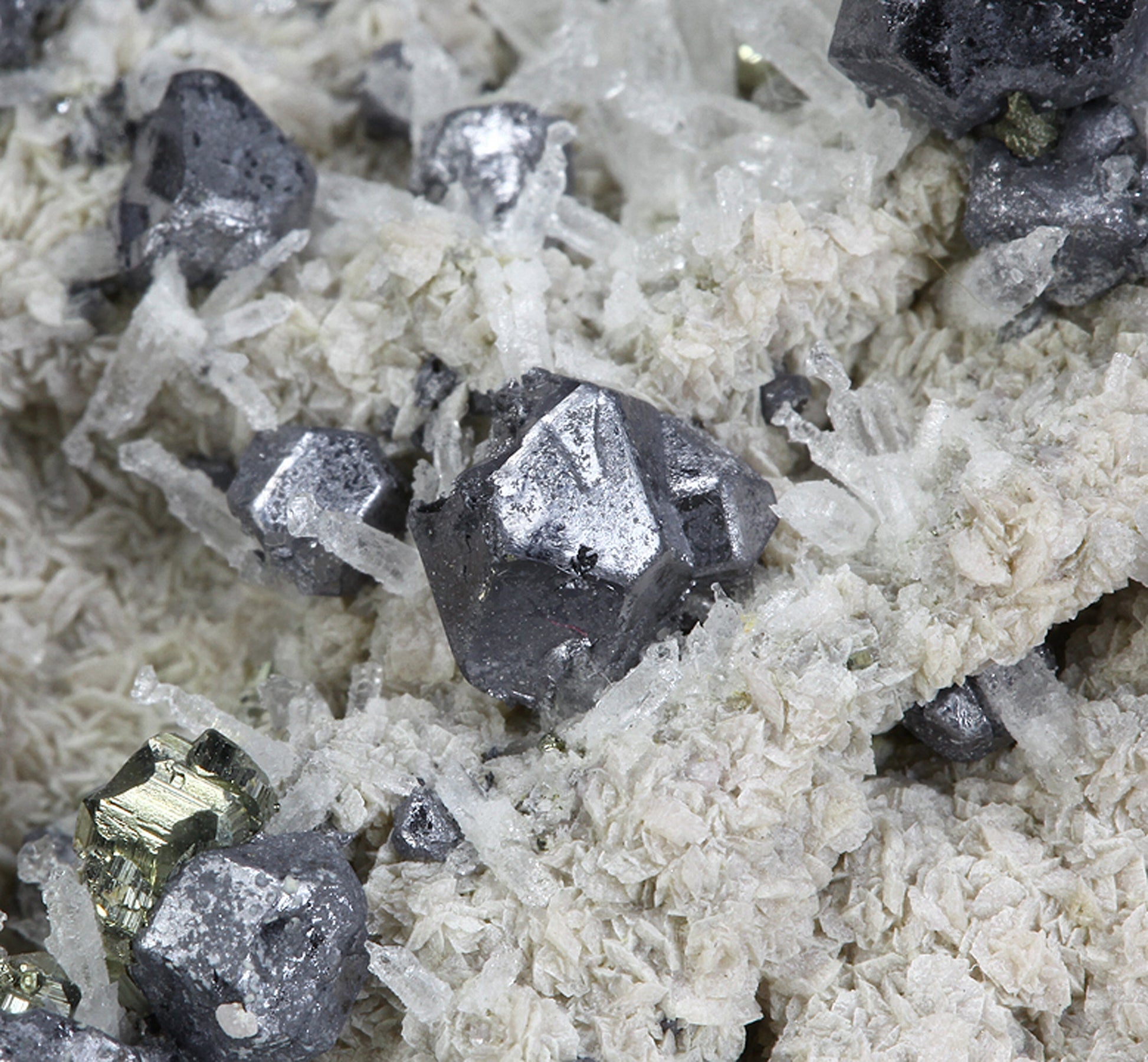 This specimen hosts dozens of sharp, cuboctahedra of silvery Galena associated with small striated pyritohedra of golden Pyrite, plus some small black groups of highly modified Sphalerite crystals on tan “discs” of Siderite matrix. Perhaps the two most interesting aspects of the piece are the smaller crystals i.e. dozens of the most unusual scepter habit Quartz crystals resembling “nail heads” on the terminations, or perhaps more appropriately, melted candles in appearance. I have photographed these strange Quartz crystals under the microscope to better illustrate their quality. Lastly, as mentioned above, small, compressed rhombohedra of pale pink Rhodochrosite can be seen on the reverse side of the specimen, making this a wonderful association specimen with a minimum of seven species present.