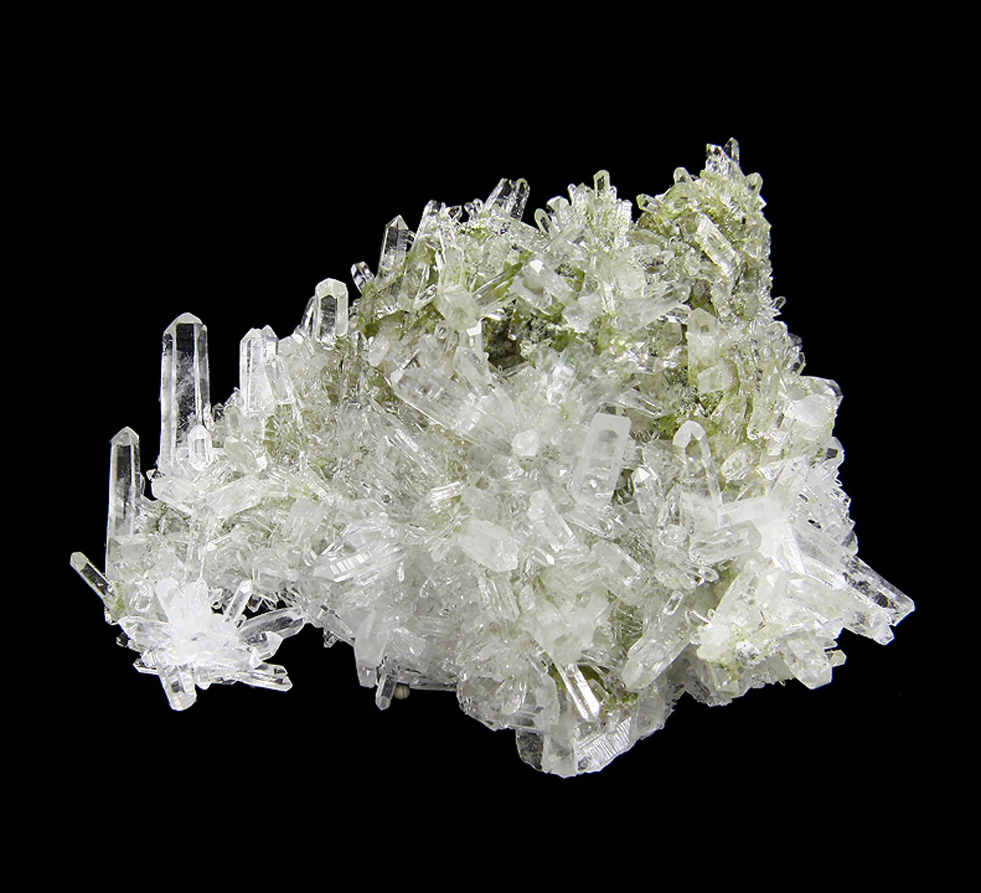 From the famous replacement ore body in the Camp Bird Mine, we have seen some of the most interesting, crystallized specimens from anywhere in the San Juans. This particular piece features dozens of bright, WATER-clear, rather lustrous, colorless hexagonal prisms of Quartz included with rarely seen beautiful pistachio green Epidote “needles”. Top quality Quartz crystals, and certainly hard to find on the market these days. No real damage to speak of on the piece.