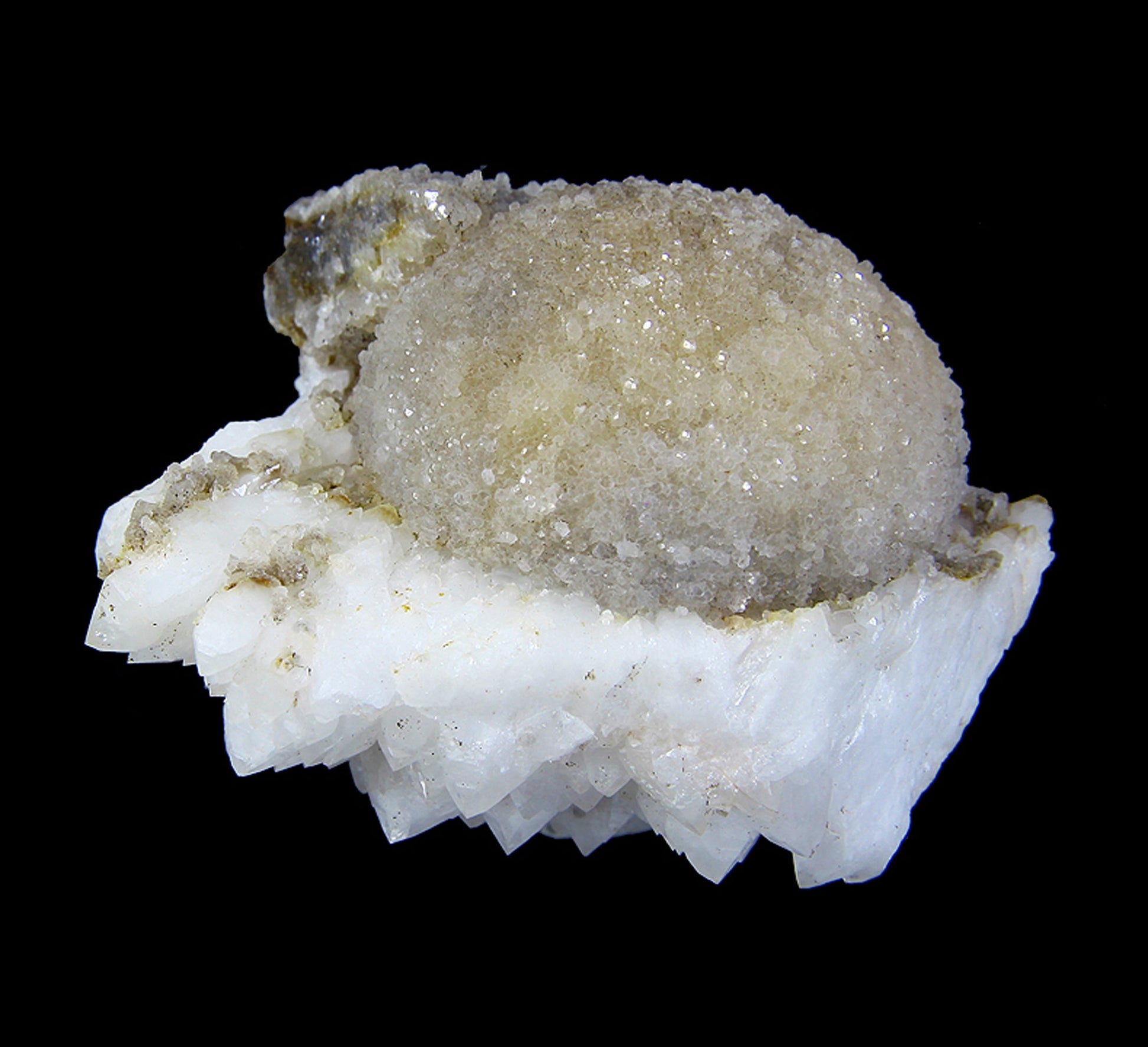 A most unusual specimen from this outcrop that was exposed and collected by Tom Hughes in the 1990s. A spherical group of silvery-golden color Calcite associated with a few smaller Calcite groups sits atop a crystallized plate of lustrous, white prismatic Quartz crystals. One of the very few pieces from this uncommon find in Cunningham Gulch.