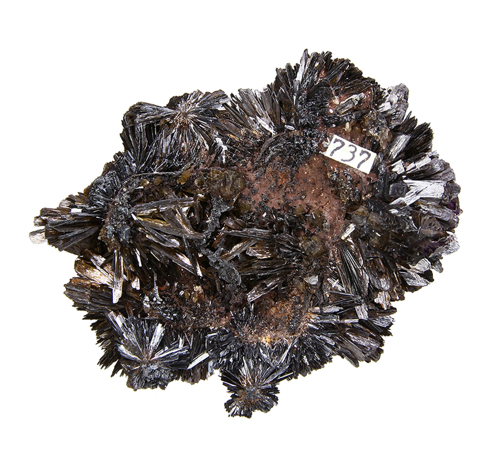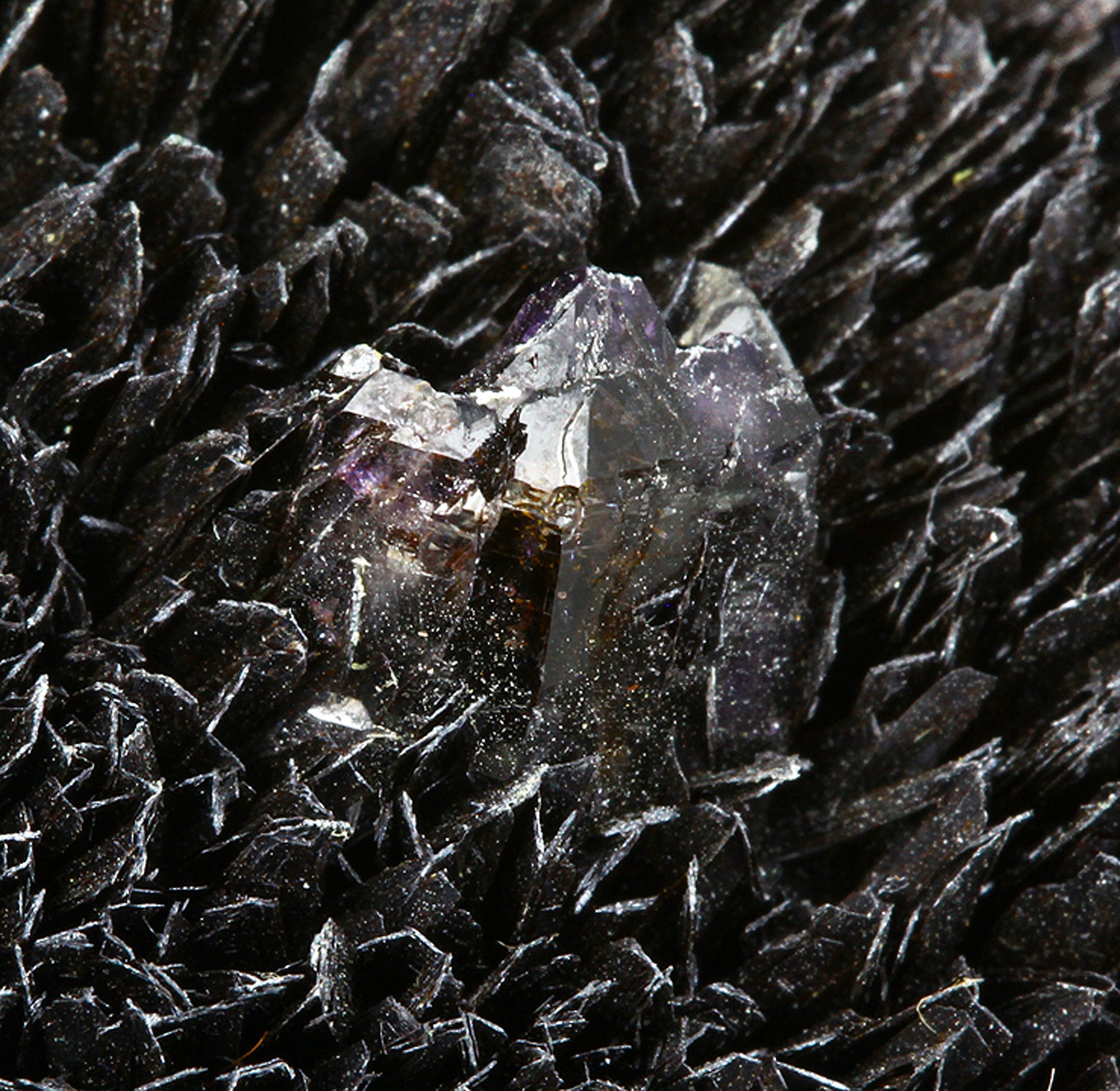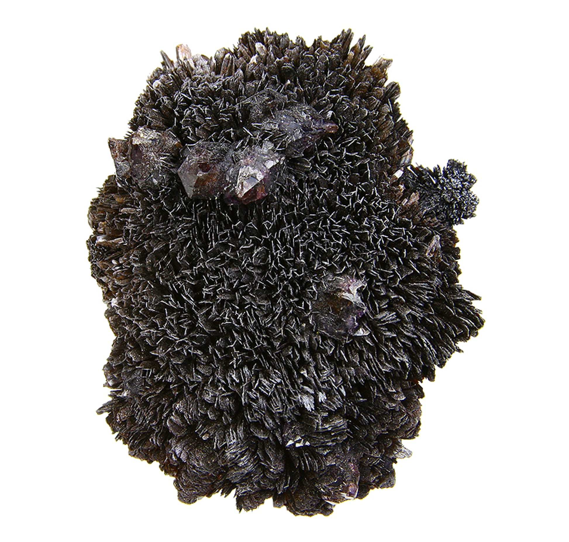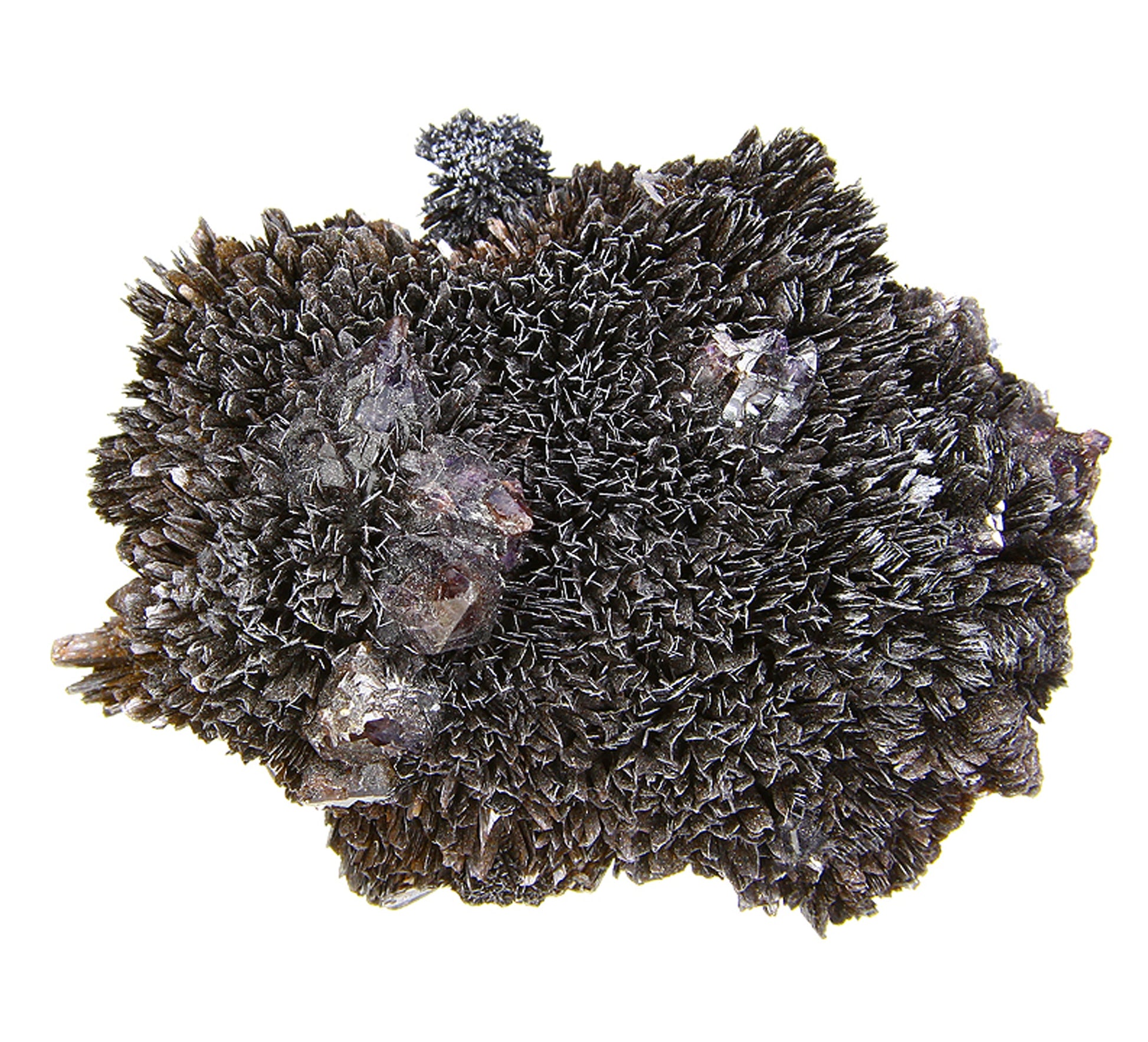 This particular specimen it is an outstanding display piece featuring top quality, sharp, lustrous, golden-black "blades" of Goethite forming a beautiful crystallized, multi-directional “mound” which is accented by very good sized, sharp, lustrous, gemmy purplish colored crystals of “Onegite” which is classified as Amethyst with Goethite inclusions. You can see the rich purple color along with the smoky color in the Quartz. The piece is crystallized all the way around save the bottom where it detached from the pocket. This piece was collected by my father in July of 1970. My dad told me this was the best one that he ever found of this material. Crystallized specimens like this are few and far between from Colorado.