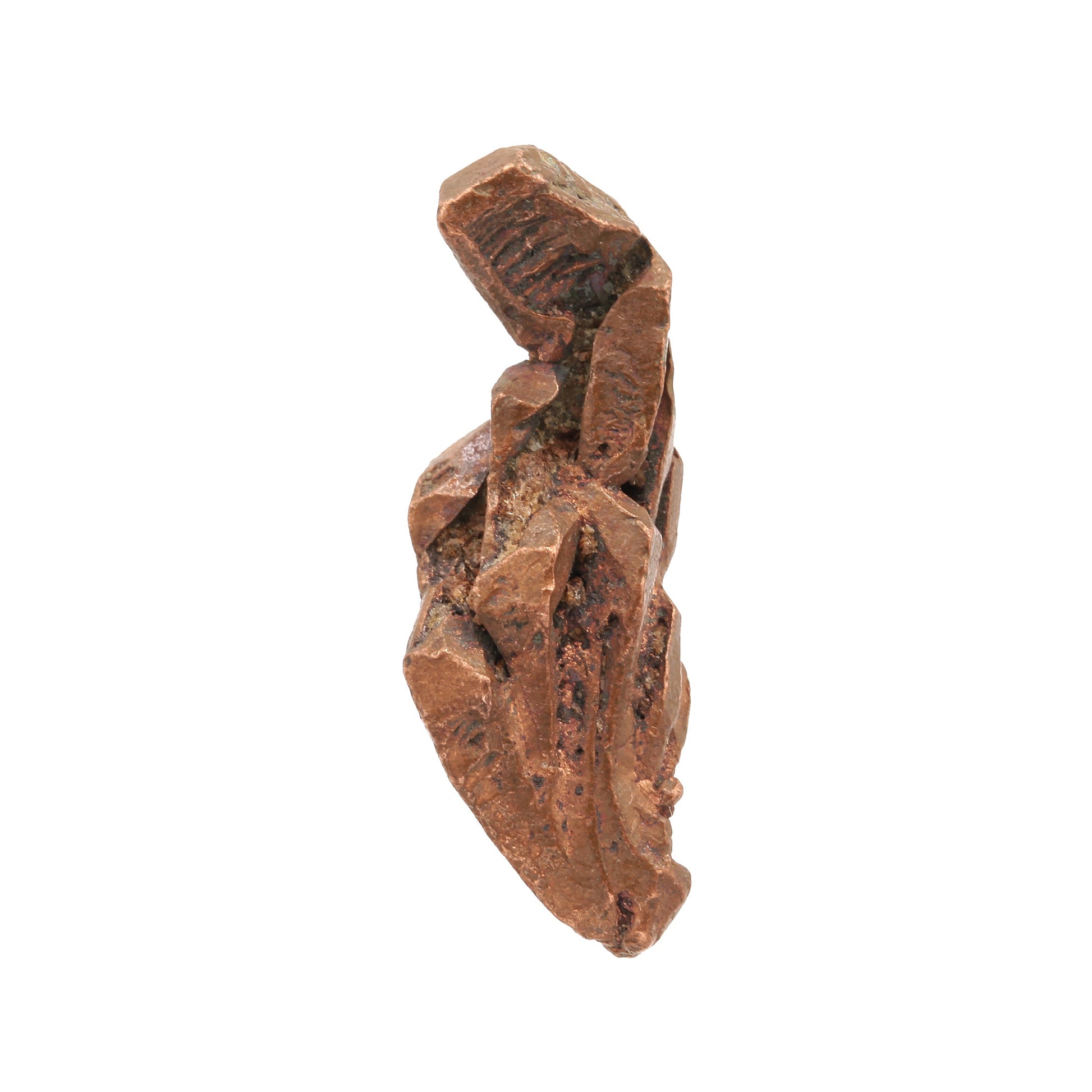 A fantastic toenail sized display specimen of fine crystallized and "Spinel"-twinned Copper from this wonderful discovery in Australia. This undamaged, showy, doubly terminated "floater" shows a marvelous combination of sharp, well-defined, euhedral crystals of Native Copper along with elongated, striated "Spinel"-twins. The piece is highlighted at the top by a wonderful dodecahedral crystal of Copper with both smooth well-formed positive faces and skeletal or "hoppered" negative faces. As you move down the length of the piece, you see the gorgeous blending of both crystal faces and twin lines to create and three-dimensional and show display specimen of these fine-looking Coppers. This is one of my favorite specimens in the lot that we purchased for its stylish and dramatic form along with the excellent overall quality.