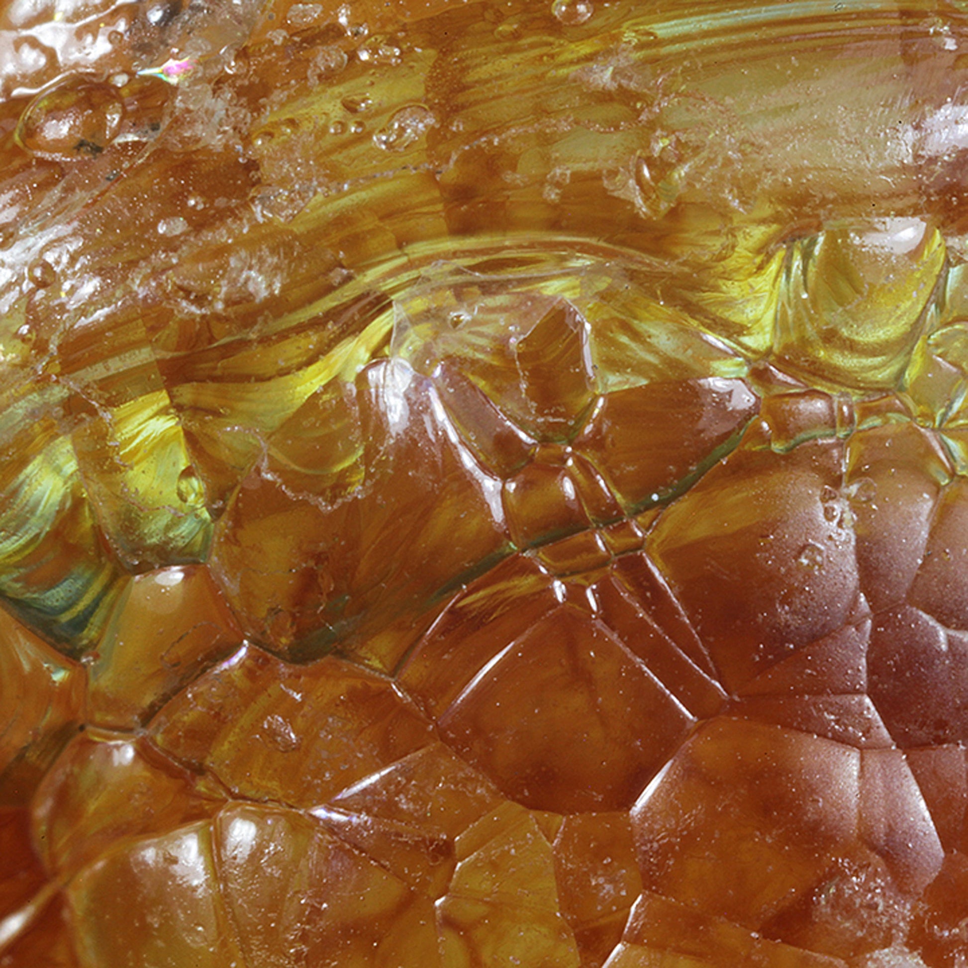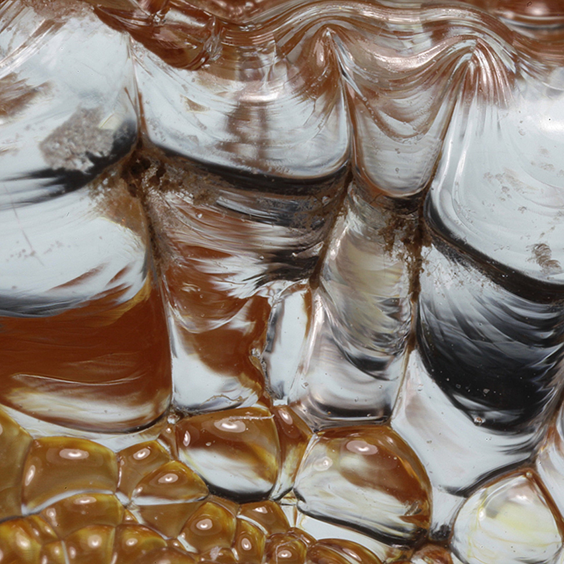 Finally, for years this material was referred to as "Hyalite" Opal, but is now listed as a variety of Opal called Opal-AN. It is now defined specifically as an amorphous (often colorless) form of Opal that is found in spherical aggregates, which are often intergrown or stacked with a "bead"-like appearance. For reference, mindat.org states that: "The "A" in the name stands for amorphous; the subscript "N" is to imply its structure is network-like, similar to silica glass; however, it still contains about 3-8% water".