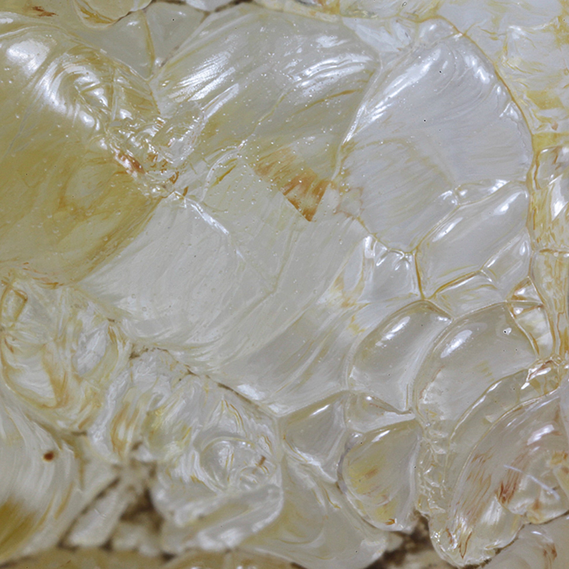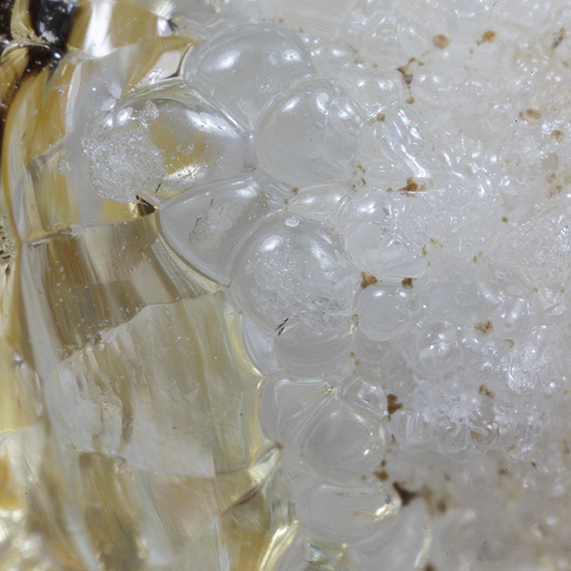 Finally, for years this material was referred to as "Hyalite" Opal, but is now listed as a variety of Opal called Opal-AN. It is now defined specifically as an amorphous (often colorless) form of Opal that is found in spherical aggregates, which are often intergrown or stacked with a "bead"-like appearance. For reference, mindat.org states that: "The "A" in the name stands for amorphous; the subscript "N" is to imply its structure is network-like, similar to silica glass; however, it still contains about 3-8% water".