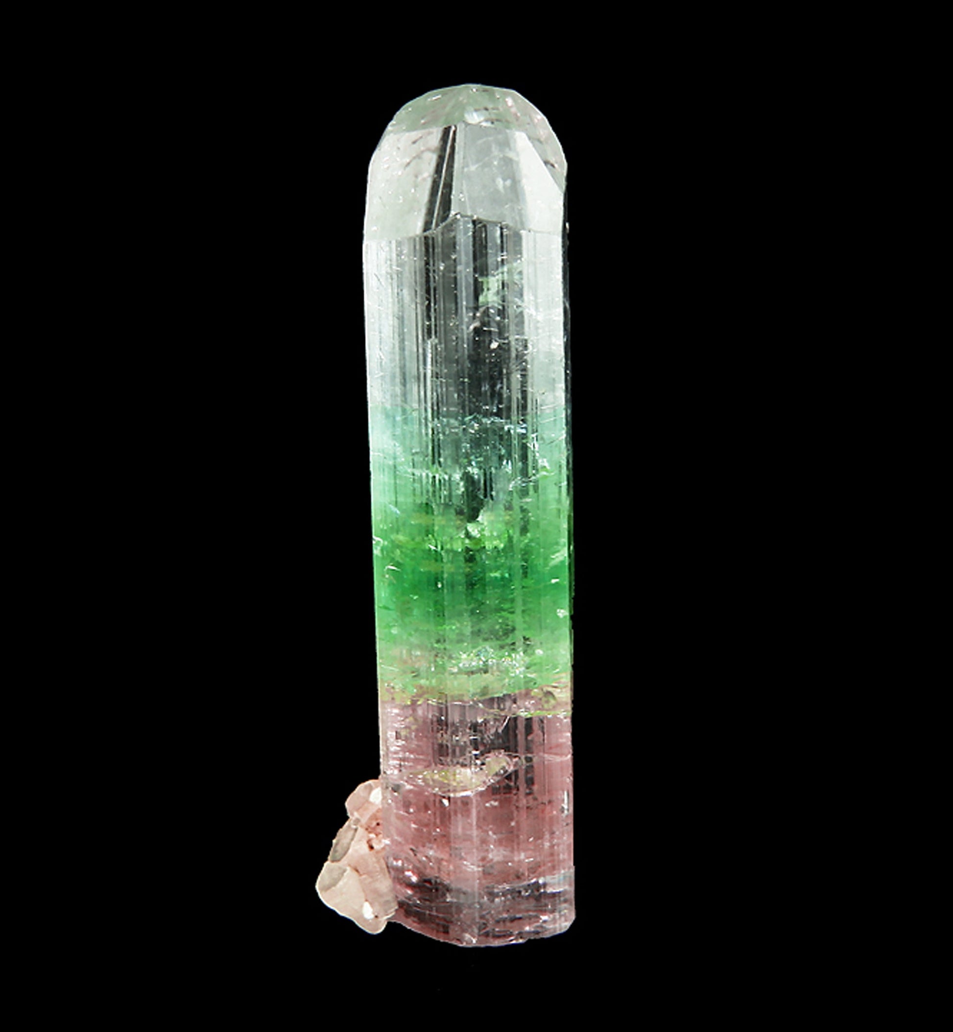 This crystal has a beautiful colorless "Achroite" termination that occupies over 50% of the crystal, which is incredibly rare in my experience with this material. The crystal grades into a gentle mint green to a stronger emerald green band which gives way to a soft baby pink hue throughout the rest of the prism. The crystal is complete all the way around, with an undamaged termination and superior luster on all faces. Minor accenting silvery-beige Muscovite makes for a nice accent at the base of the crystal.