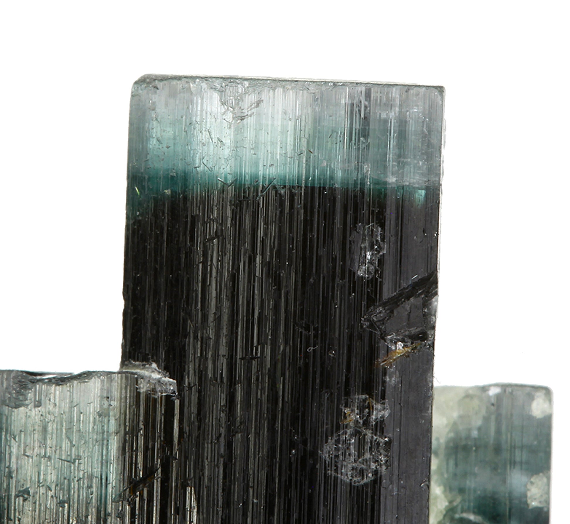 Tourmalines are certainly among the most popular species for collectors, and no matter how many one encounters, a good one will always draw attention. This beautiful specimen has a striking color combination with gemmy colorless "Achroite" terminations, which give way to a stunning teal/blue color that mixes into an inky purple color (almost black) in the center.