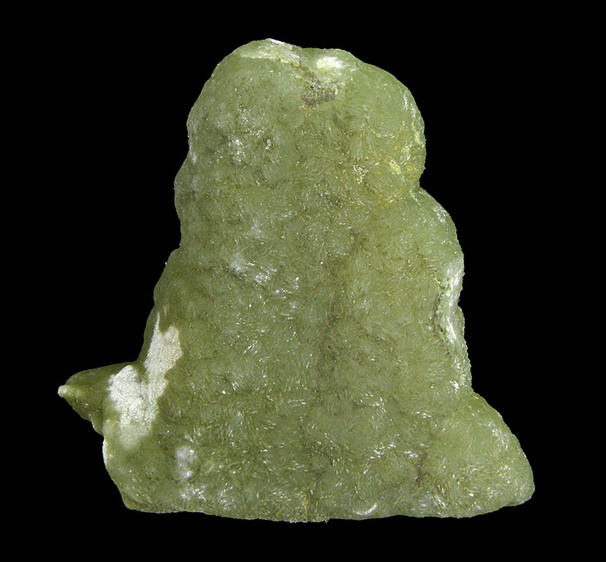 An aesthetic, eye-catching miniature sized display specimen of Prehnite after Anhydrite from this famous discovery in 2010. This specimen displays on its own without the aid of a base or clay and is complete all the way around. The piece is slightly rough in areas as it may have been growing against the pocket wall. The piece has a two-tone effect that is caused by a deposition of a brownish mineral on the back of the piece. The front of the specimen shows a darker green color than most from the find, along with good luster and decent gemminess.