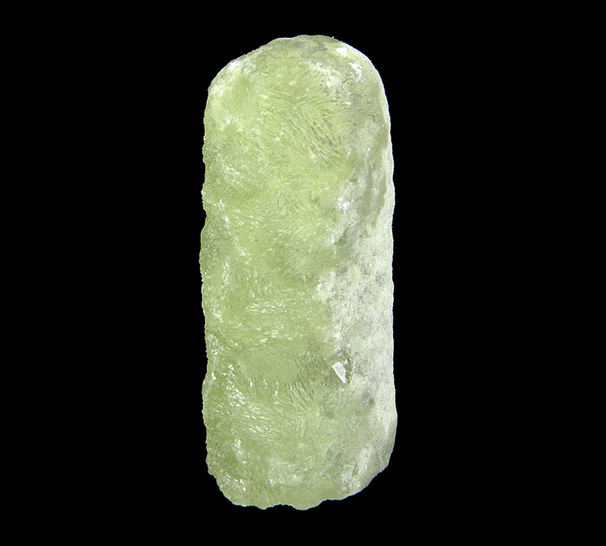 A classic, single finger-shaped cast of Prehnite after Anhydrite with good luster on the display side, and a slight coating of a secondary clay mineral on the back. The underside of the piece shows the square cross-section of the once preexisting Anhydrite crystal that was the base for the cast.