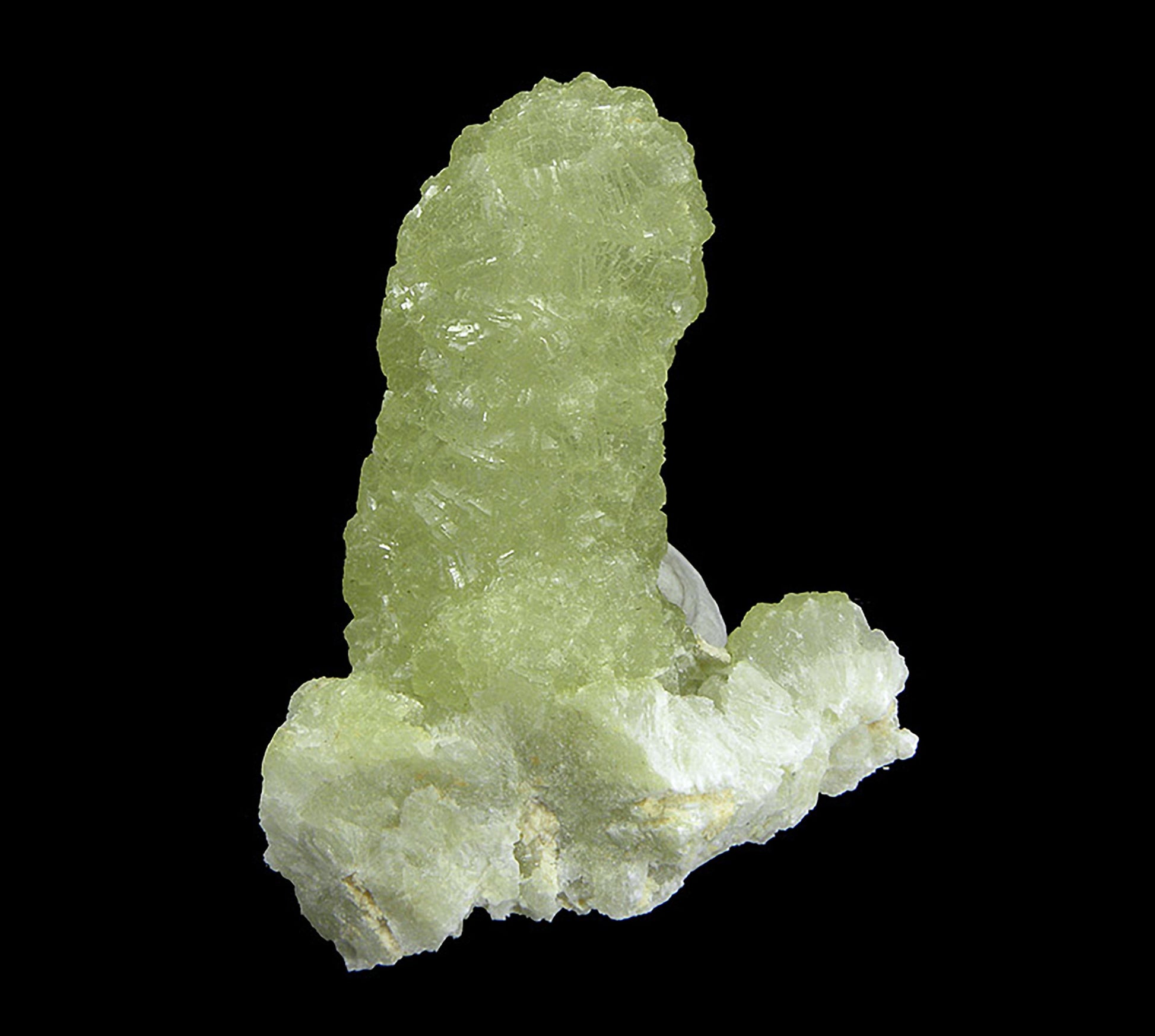 A good sized, lustrous, nice green color, gemmy, isolated Prehnite finger after Anhydrite is shooting out of the center of this miniature sized specimen. The finger is complete all the way around and has a very slight coating of a secondary clay mineral. An attractive display specimen with the classic form that made the pieces from this discovery famous.