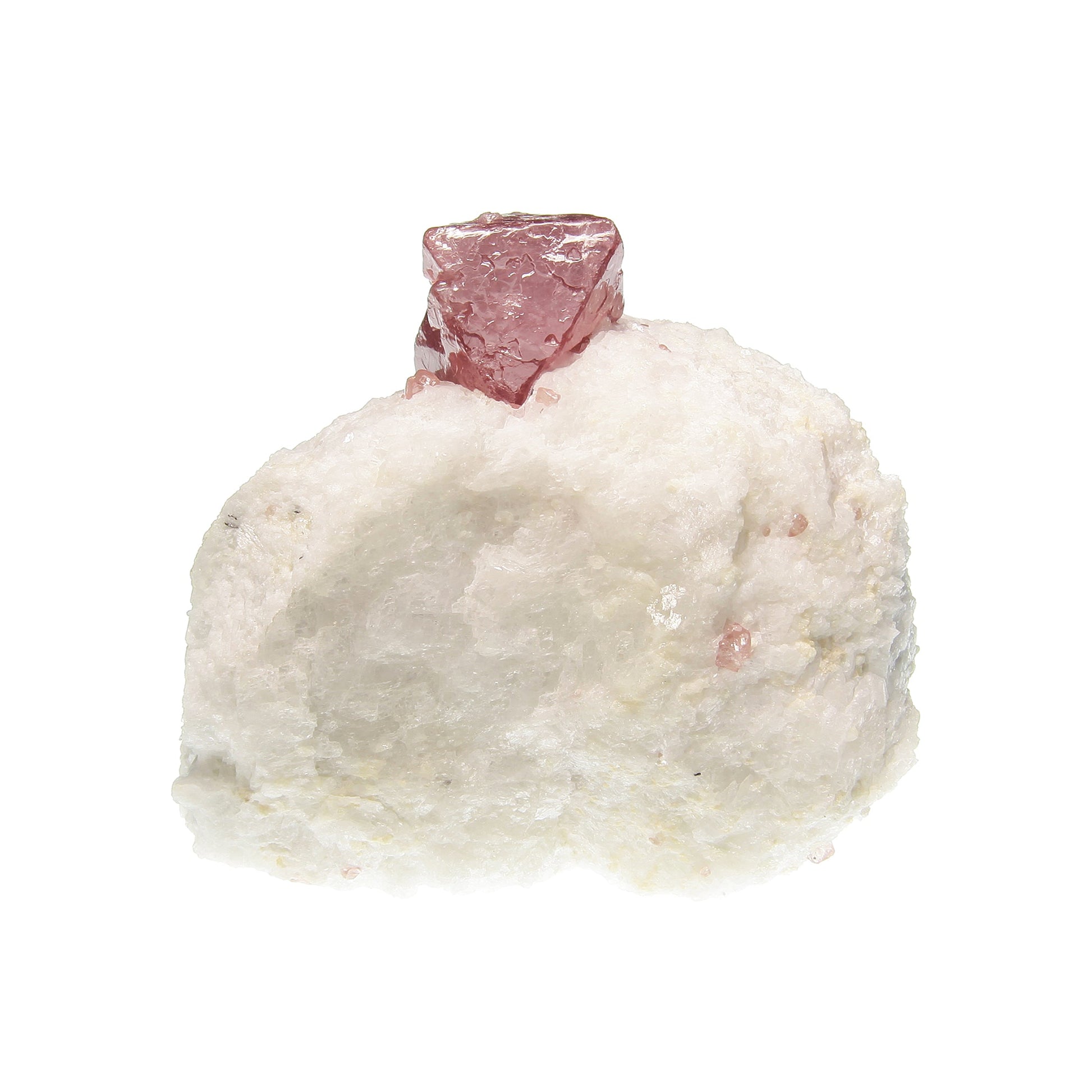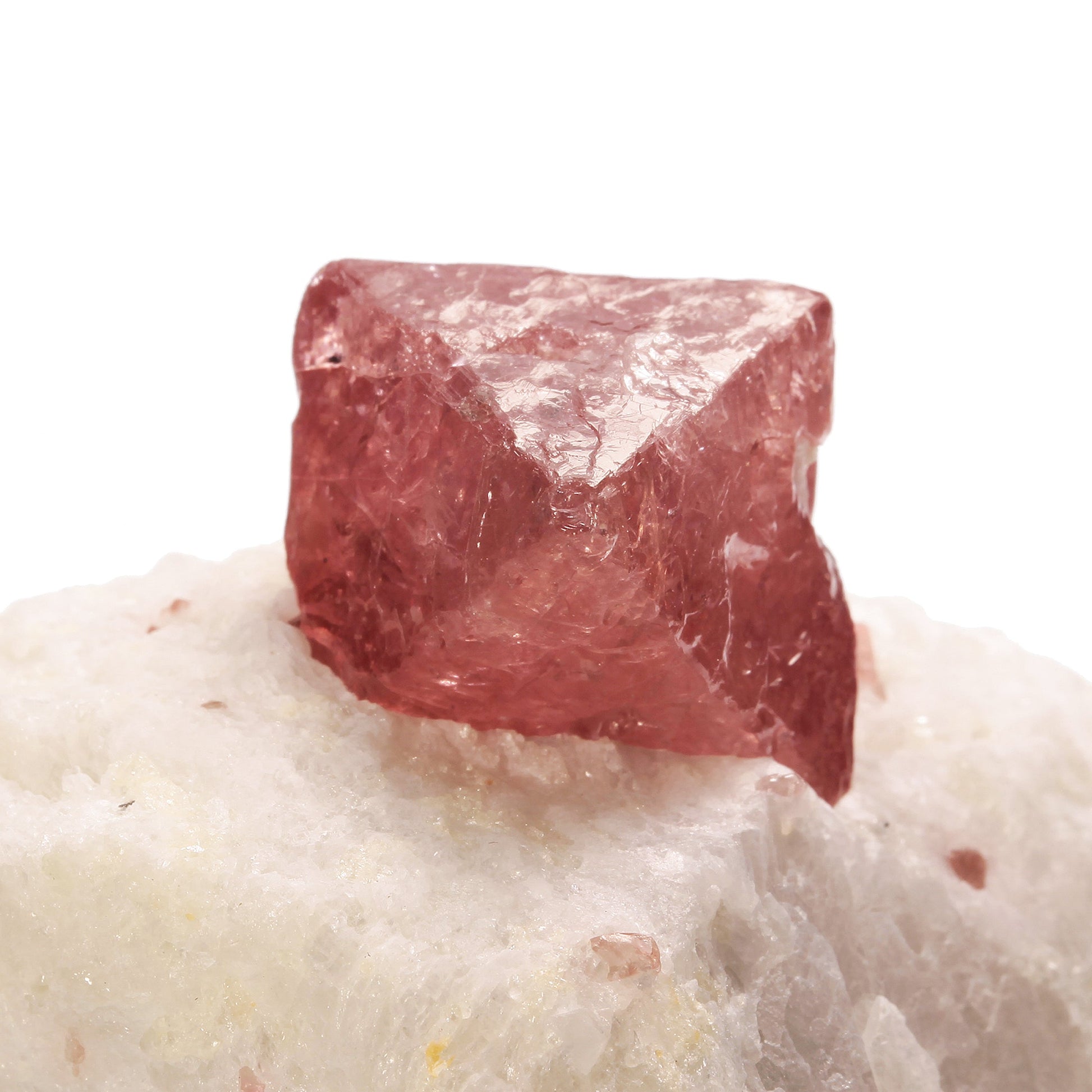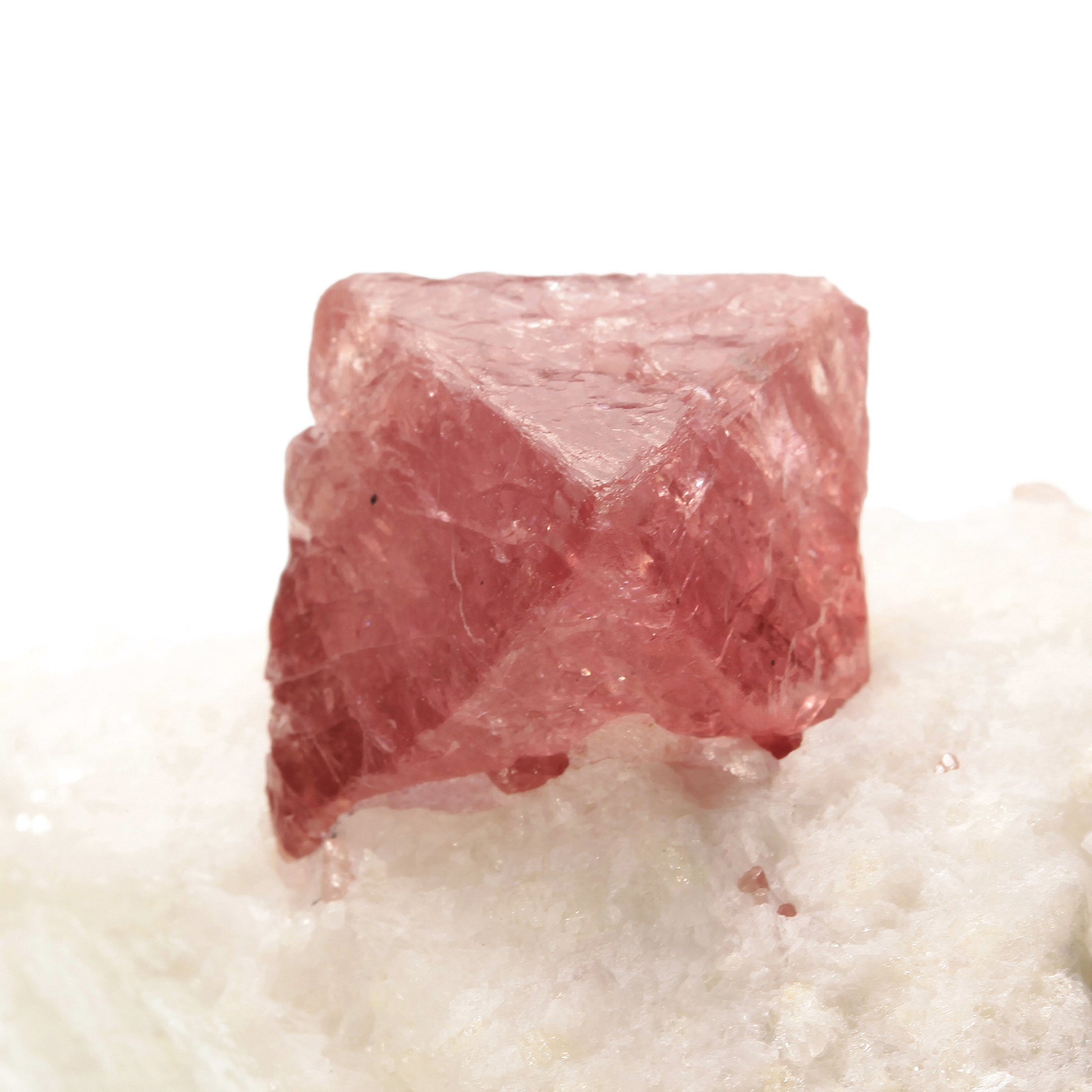 A superb small cabinet display specimen featuring a large (nearly a full inch) free-standing Spinel crystal with very sharp, highly lustrous faces and textbook octahedral form flaring out of sold white marble matrix. The main Spinel crystal is completely undamaged and it's NOT repaired, which is significant, as the vast majority of Spinels from this locality are glued back on the matrix. The color is a strong reddish-pink, and the crystal shows good translucency when backlit.