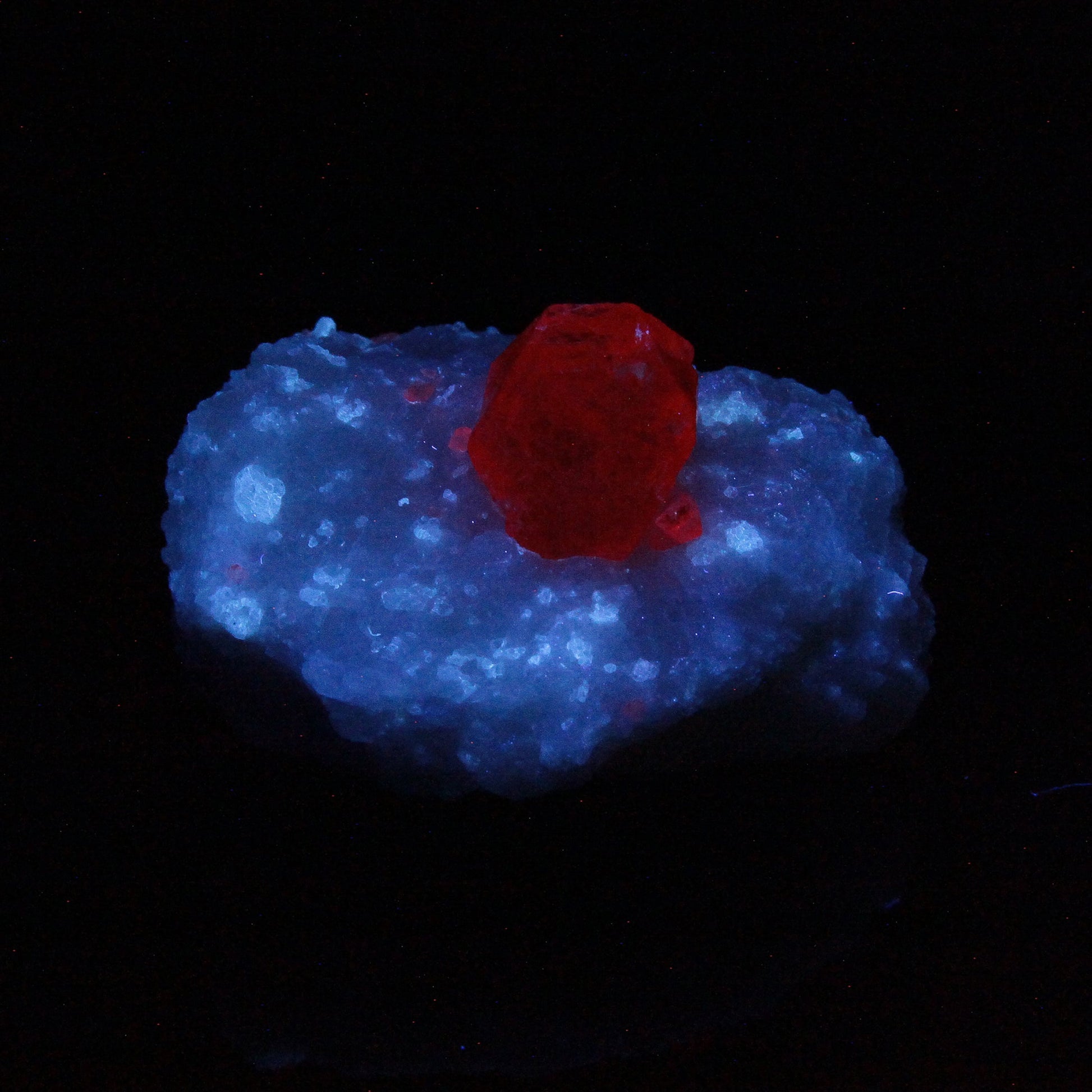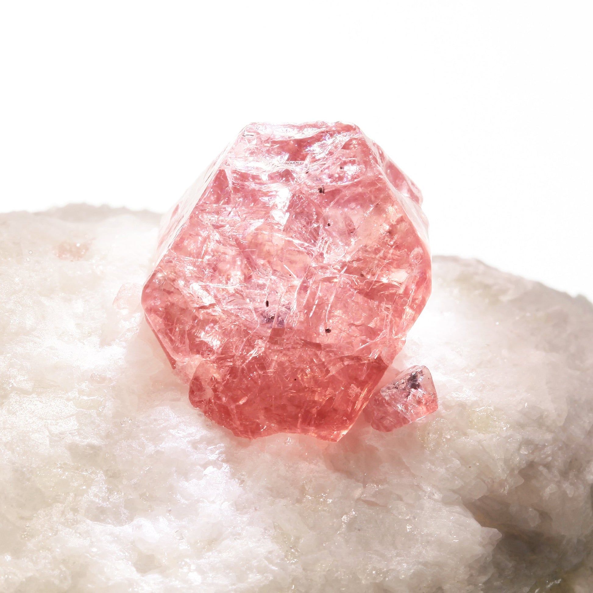 A superb small cabinet display specimen featuring a very good-sized free-standing octahedral crystal of beautiful reddish-pink Spinel with very sharp, highly lustrous faces and textbook form flaring out of sold white marble matrix. The Spinel crystal is completely undamaged and it's NOT repaired, which is significant, as the vast majority of Spinels from this locality are glued back on the matrix. The color is beautiful in person, and the crystal shows excellent gemminess / translucency when backlit. You can see in the last photo that the crystal displays a superb deep red fluorescence under UV light.
