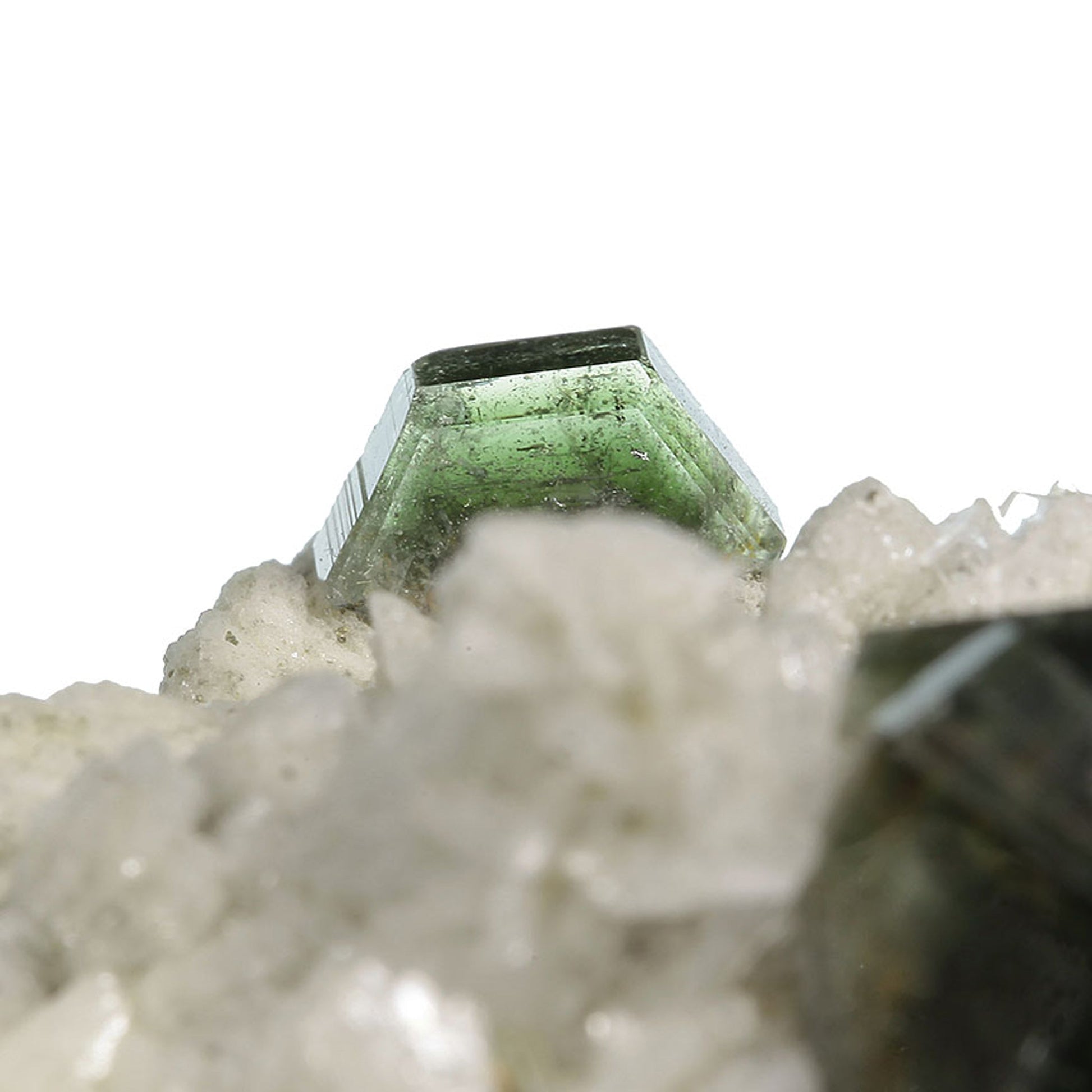 Here we have a really attractive miniature specimen featuring a few green colored Apatites from the famous Sapo mine from a few years ago. These crystals have a unique appearance with compressed prismatic form, but still show very sharp, highly lustrous faces with nice translucency, aesthetically perched atop bladed white Albite matrix. The crystals are green at their core but are nearly colorless around the edges when backlit. The Apatites measure up to 8 mm across, and I don't see any damage on the display side. If you collect Apatites, phosphate or Brazilian minerals, don't miss out on this eye-catching Apatite. It appears that Sapo may never produce these attractive specimens of unusual Apatite again.