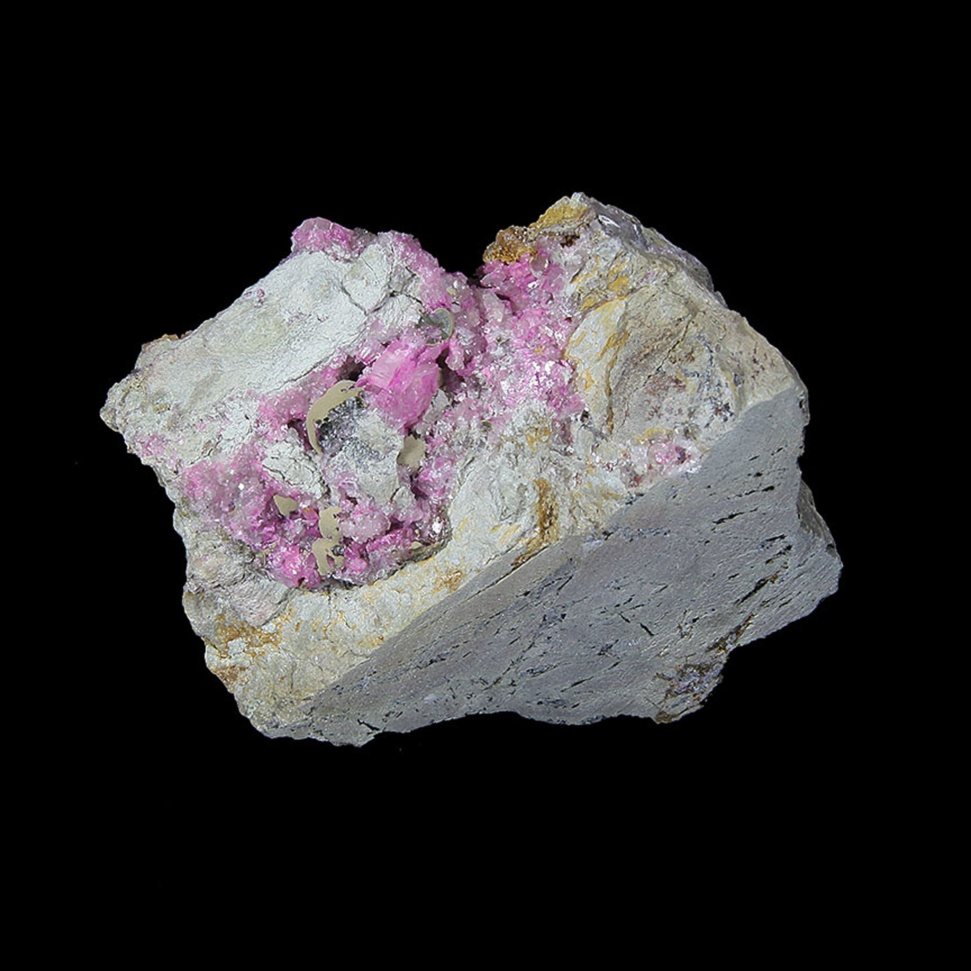 The specimen hosts beautiful botryoidal groups of beige Kolwezite (with dark green cores) associated with wonderfully contrasting pink Cobaltoan Calcite on matrix. The largest sphere of Kowlezite measures 4 mm across. My favorite aspect of the piece is that the spheres are isolated(!) and aren't just a big intergrown mass or a loose group off matrix. It's incredibly rare to find single spheres of this species undamaged on matrix and would be a very worthwhile pickup for any rare species collector.