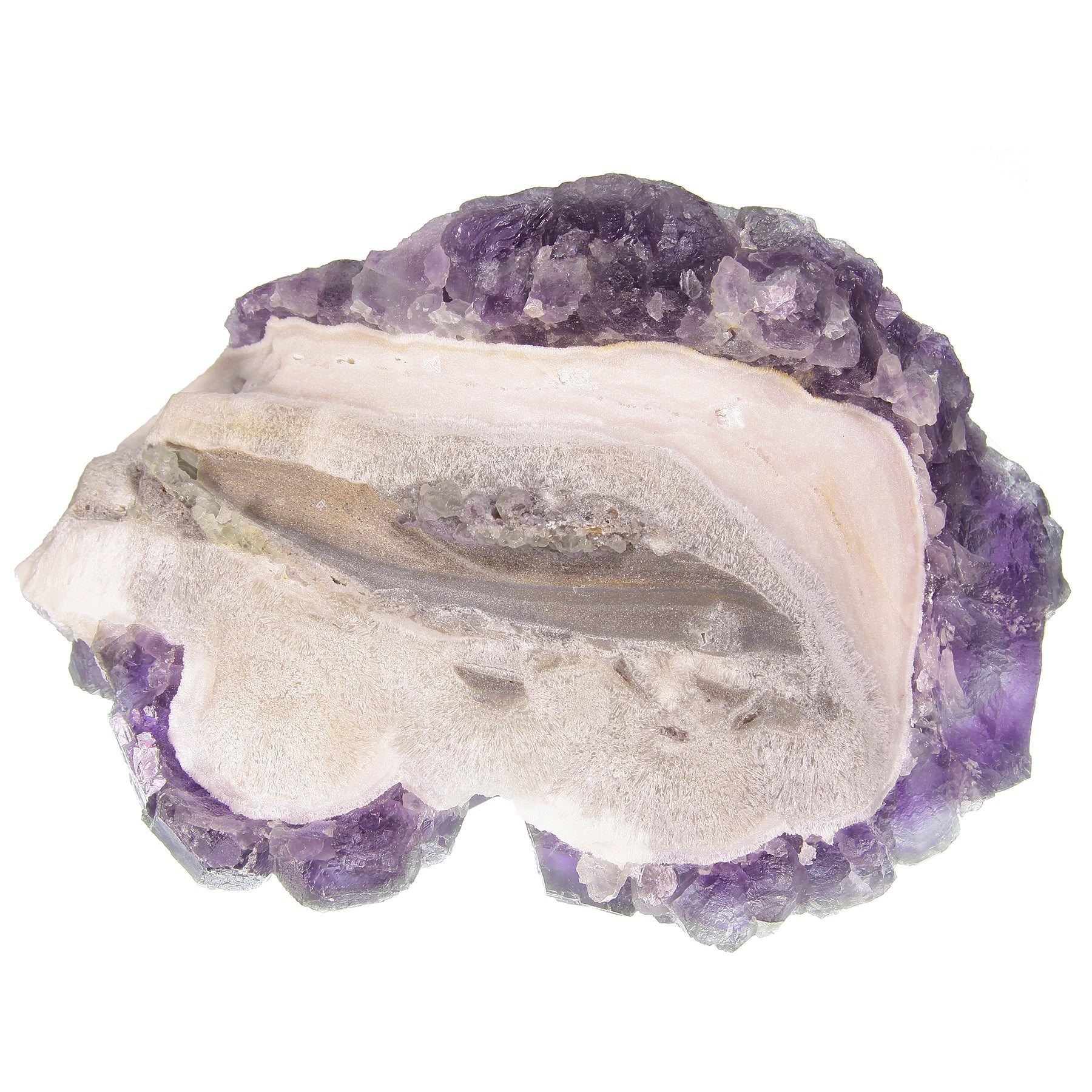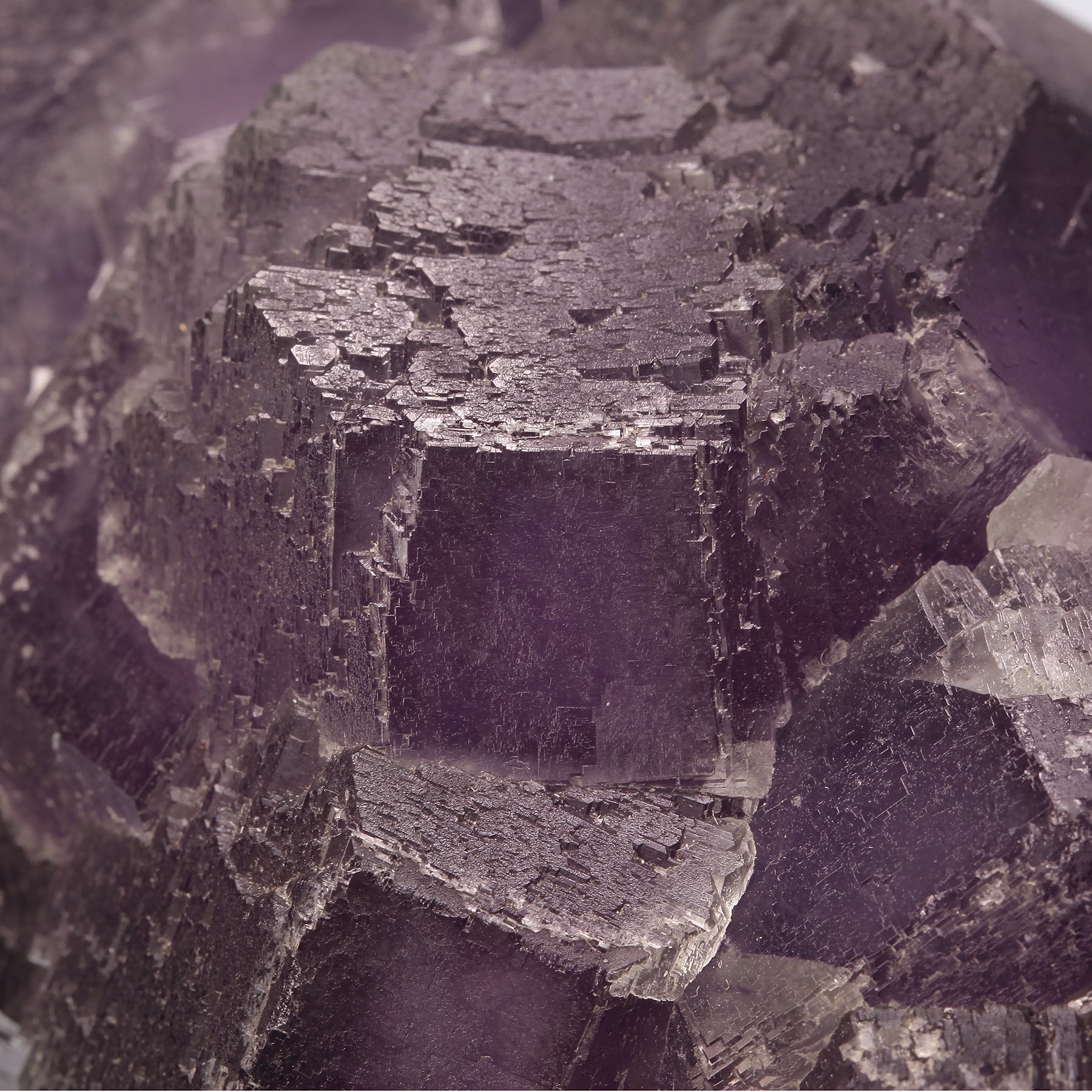 Gorgeous, gemmy, intensely purple, grape-like Fluorite cuboctahedrons (with the largest composite group measuring 4.2 cm across) are richly and aesthetically scattered on a thick hefty mound of banded and etched Quartz from a discovery in the early 2000s at the De’an Mine in China. The Fluorite crystal faces actually have a slight curve to them, which is not terribly common for this material. On the surface, the color is a dark purple hue, but when backlit, the color has a slight pinkish tinge to it under halogen light, while LED lights show more of a blue tone. A superb specimen for the size, given the coverage and quality of the grape-juice-colored crystals. Virtually no damage of note, outside of the periphery / base where it was removed from the pocket.