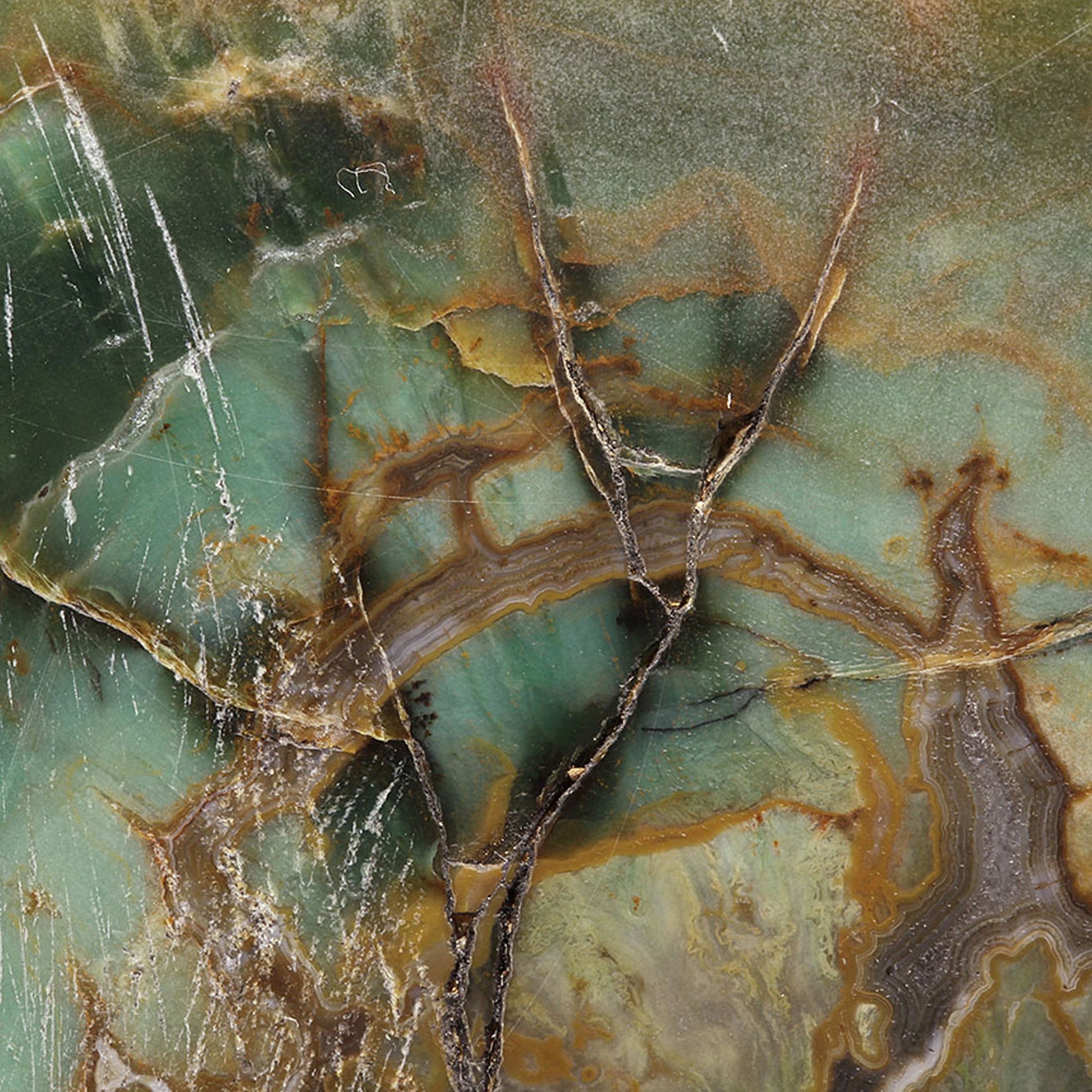 Petrified wood is found in a wide range of colors, but green is certainly rare worldwide. I'm told that the color is caused by nickel content, and it's not dyed, as you can clearly see solid green patches on the back (unpolished side) of the piece. The form of the original tree is clearly seen and well-preserved. If you look closely, you can actually see patches of beautiful soft lilac and golden-brown colored banded Agate which has filled in some of the open vugs in the wood! This is INCREDIBLY rare in our experience with this material and certainly makes the piece more desirable for collectors.