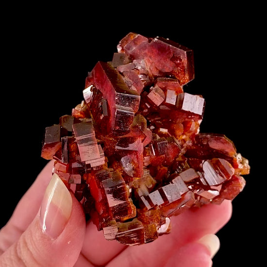 Moroccan Vanadinites simply are the finest examples of the species extant. The best pieces still command a premium on the market, even though specimens are still being found to this day. This piece is an exemplary, aesthetic, group of superb quality, rich red color, razor-sharp, very lustrous, broad / thick hexagonal crystals free of matrix. The largest Vanadinite measures a full 2.7 cm across. Great aesthetics and good quality all around! Just a few little nicks, but still an impressive showy Vanadinite from this most famous of Moroccan localities. BETTER IN PERSON. It's such an impressive piece for the superior color, fine quality and robust crystals. This is old material dating back to the early 1980s, the likes of which are rarely seen on the market today.
