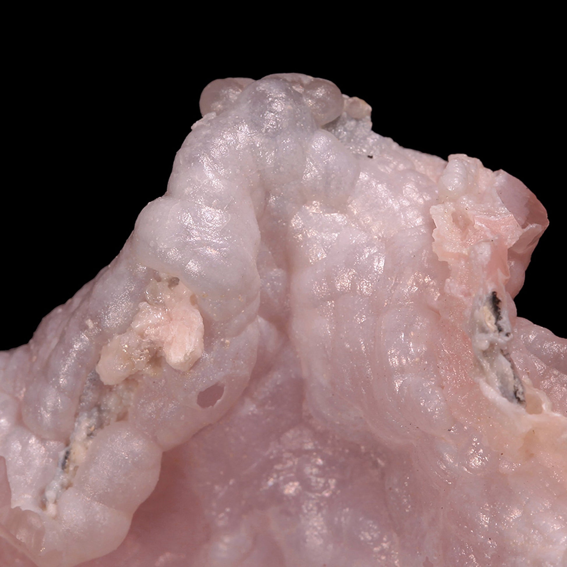 The material shows an almost botryoidal form with a soft, flowing, almost ethereal appearance. When exposed to SW UV light, you can see a striking fluorescent neon-green glow from a thin coating of Hyalite Opal (now called Opal-(AN)) which is only slightly visible in daylight. This is not only pink in color but shows a beautiful secondary overgrowth of gorgeous pale lavender Opal as well. When the piece is backlit, it shows a wonderful internal color. I haven't seen much of this material on the market, and I think it's incredibly beautiful and eye-catching for Opal in terms of color and form.
