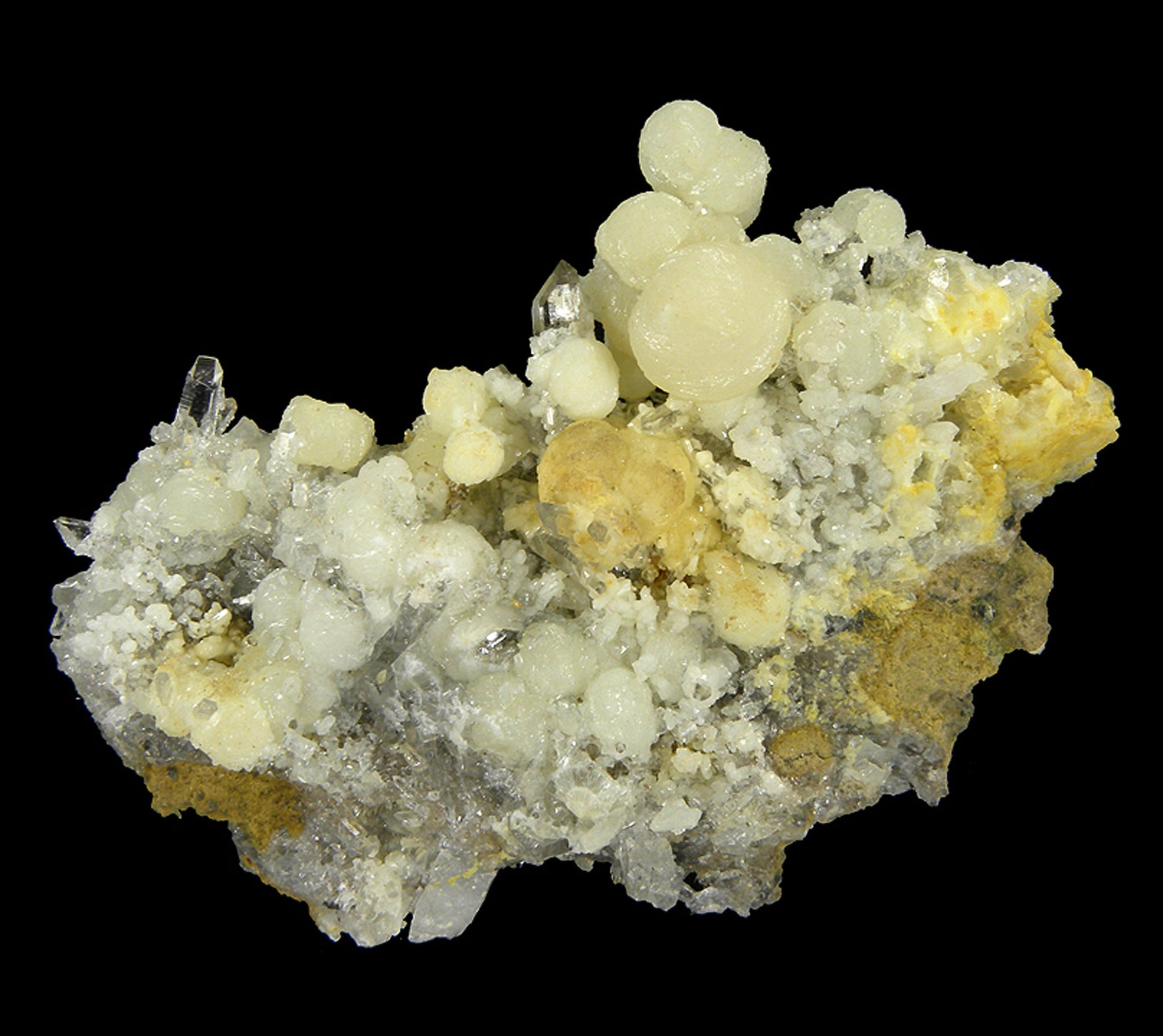Several excellent, somewhat lustrous to satiny, translucent to opaque radiating yellow to light yellow-cream colored “balls” of Wavellite are associated with GEM to gemmy, prismatic colorless Quartz crystals on matrix. Good quality all the way around, and certainly aesthetic compared to most Wavellites from this mine.
